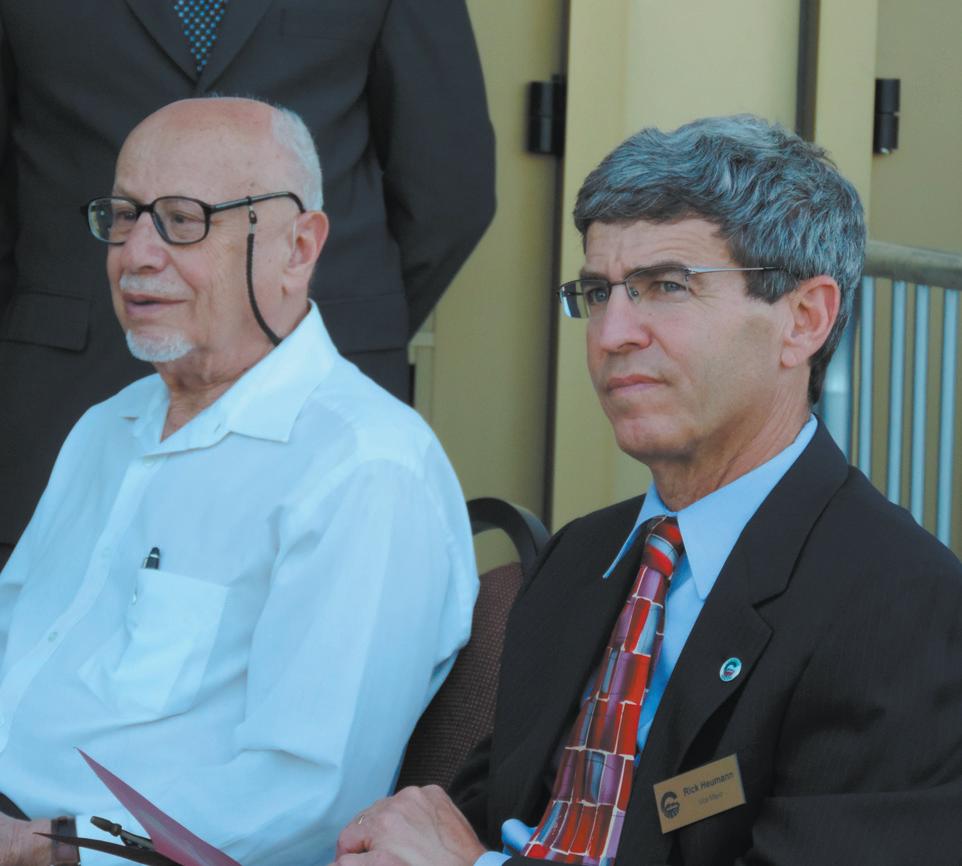 NATURALIZED CITIZEN: George Kalman, left, and Vice Mayor Rick Heumann listen during the naturalization ceremony. Kalman is a survivor of the Neudorf camp in Austria and is one of the survivors featured in “Our Story.”