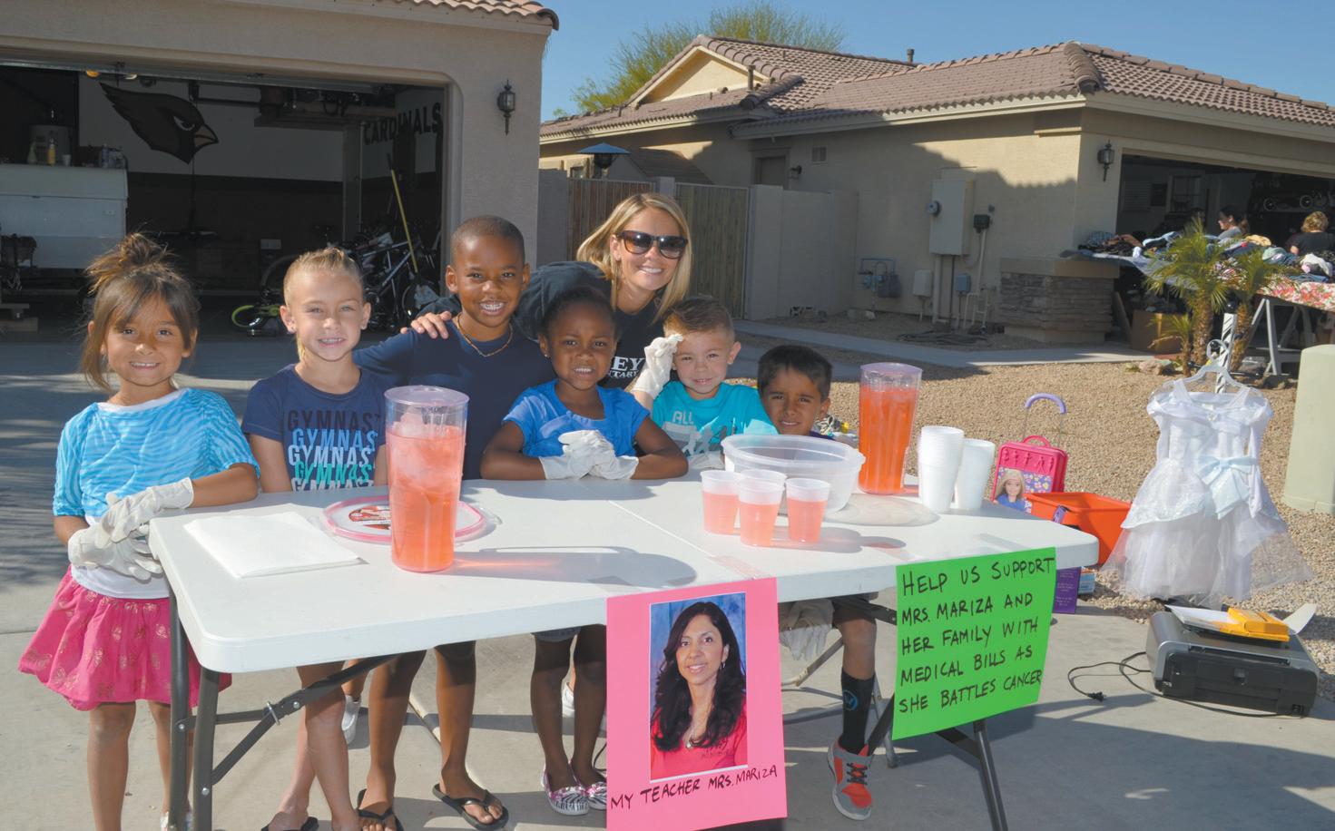 WITH A LITTLE HELP FROM HIS FRIENDS: Lincoln Fife, second from right, sells lemonade for teacher Mariza Martinez-Gay with some friends, from left, Elisha Wells, Dakota Fife, Alec Grant, Olivia Grant, Lincoln, and Genesis Wells. Mother Davi-Anne Fife is in the back row. MartinezGay is pictured in the photo at front. STSN photo by Ron Lang