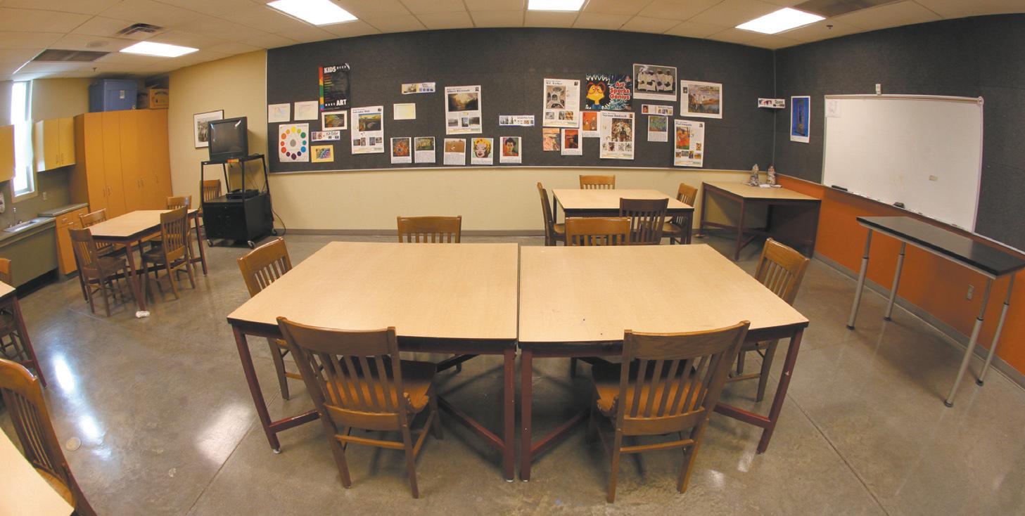 The Open Arts Studio is equipped with tables and chairs, two sinks and a few posters on how to use colors, as well as artwork.