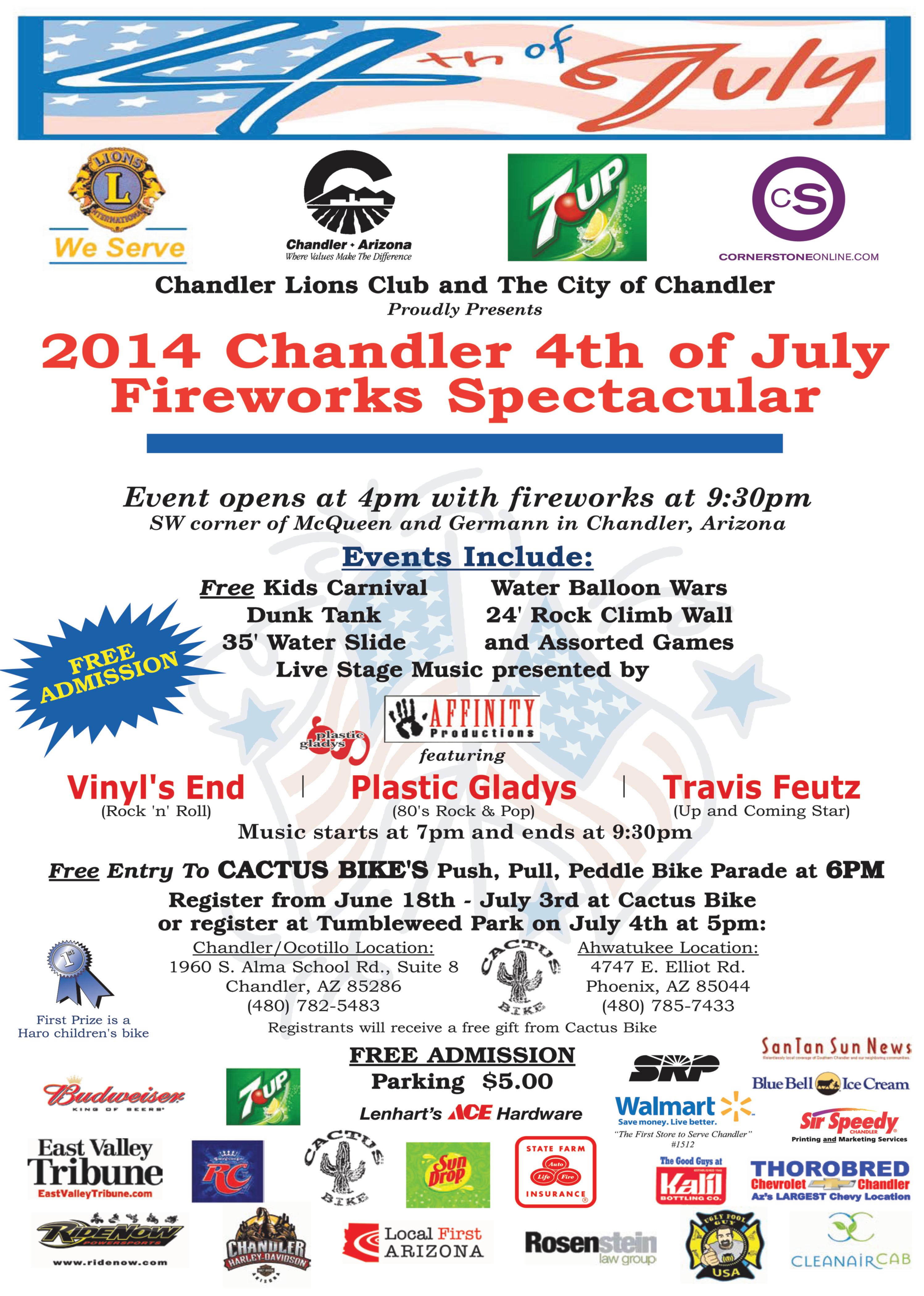 Last year’s event was scaled down, but the organizers of this year’s Chandler’s Fourth of July Fireworks Celebration are raring to go with an event that is back to its usual size. The Chandler Lions Club, in partnership with the City of Chandler, is hosting the family friendly event from 4 p.m. to 10 p.m. Friday, July 4, at Tumbleweed Park, 2250 S. McQueen Rd. Admission to the park is free, and on-site event parking is $5 per vehicle. A 20- to 25-minute aerial fi reworks display will begin at 9:30 p.m. In addition to fi reworks, the event features live music, a free kids carnival, a bike parade and food and beverage vendors. Activities include a 35-foot water slide, 24-foot rockclimbing wall, dunk tank, and assorted water games and interactive amusements for kids. Three local bands will perform live music