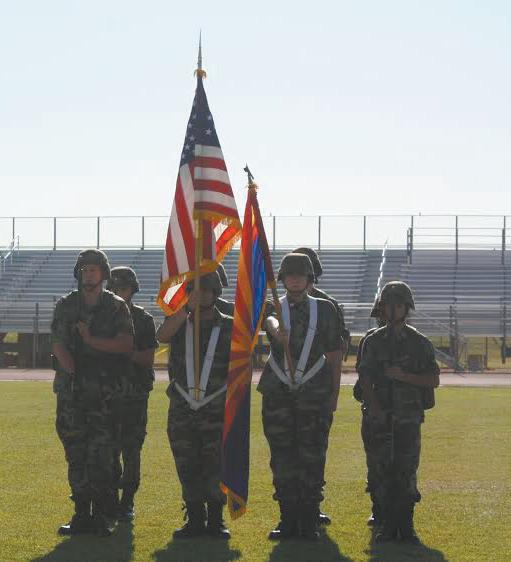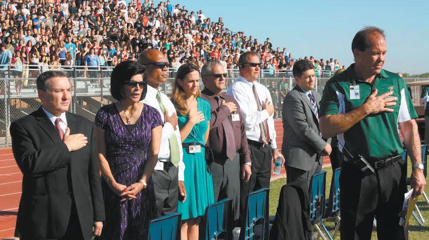 BASHA BEARS: Basha High Principal Ken James, green shirt, and guests stand for the national anthem. Left to Right: Mike Gardner, Arizona Education Foundation; Dr. Camille Casteel, superintendent; Dr. Craig Gilbert, assistant superintendent for secondary education; Lana Berry, assistant superintendent for business services; Frank Narducci, assistant superintendent for elementary education; Frank Fletcher, associate superintendent for support services; and Dr. Matt Strom, director of research and development.