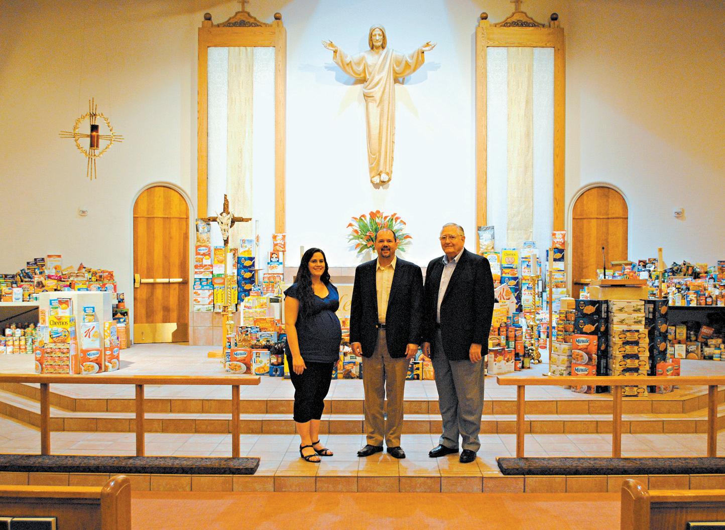 FOOD DRIVE: Trinity Donovan, CEO of the Chandler Christian Community Center, the Rev. Ron Burcham, senior pastor of Risen Savior Lutheran Church and School, and food drive co-chairman Bryan Newman stand among the results of the congregation’s four-week food drive. Food drive cochairwoman Kathleen Newman is not pictured. Submitted photo