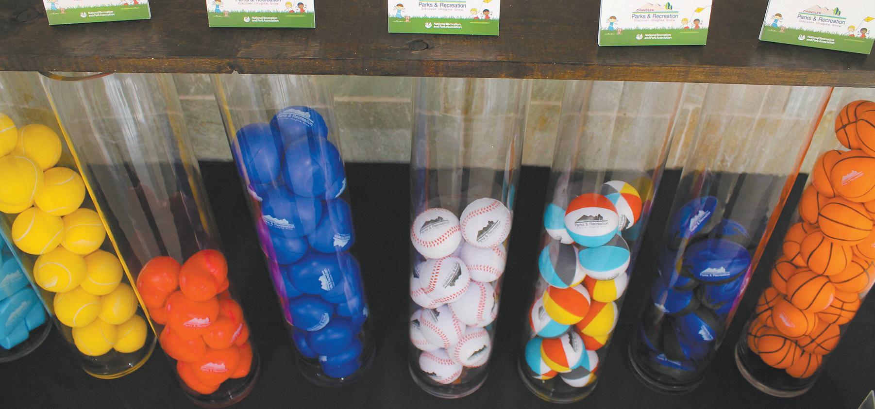 As part of the July commemoration, visitors to the Chandler City Hall lobby can see a display of stress balls in shapes representing various sports and activities. The stress balls, stacked in several clear tubes, depict the calories burned while participating in a variety of outdoor activities. Each recreation facility, as well