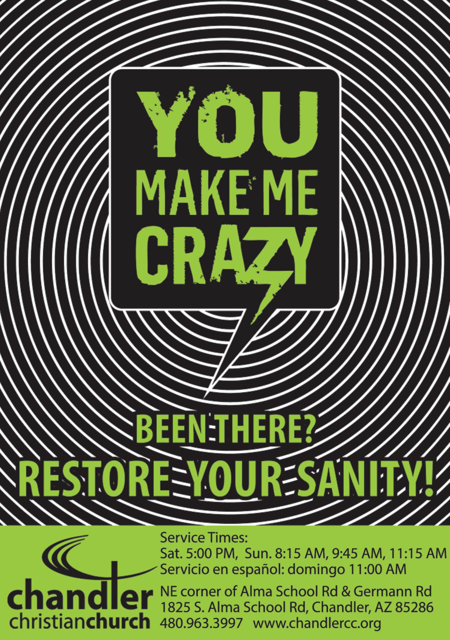 “You Make Me Crazy,” a series of sessions discussing how people can work on more positive relationships with others, is offered on weekends throughout July by Chandler Christian Church, 1825 S. Alma School Rd., Chandler.