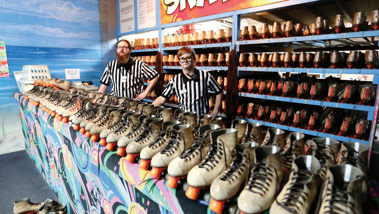 FRIENDLY FACES: Didn’t bring your own skates? Bryan Helton and Spencer Knippers can get you outfitted with a pair and get you on your way to the fun.