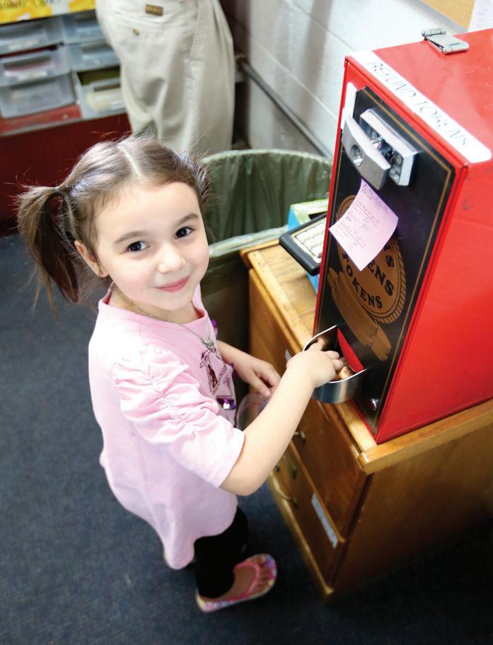 MOTHER’S LITTLE HELPER: Amelia Petersen, daughter of Skateland’s Event Coordinator, Donna, sometimes takes a break from the fun on the rink to help out in the office. It’s just as much fun, from the look on her face.