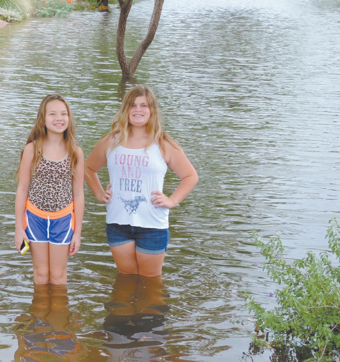 KNEE DEEP: Lindsay Zadakis and Chloe Lewandowski, both seventh graders at Bogle Junior High School, stand in the flooded green belt in their neighborhood. Throughout the Valley, record rainfall turned grassy areas into make-shift lakes. STSN photo by Tracy House