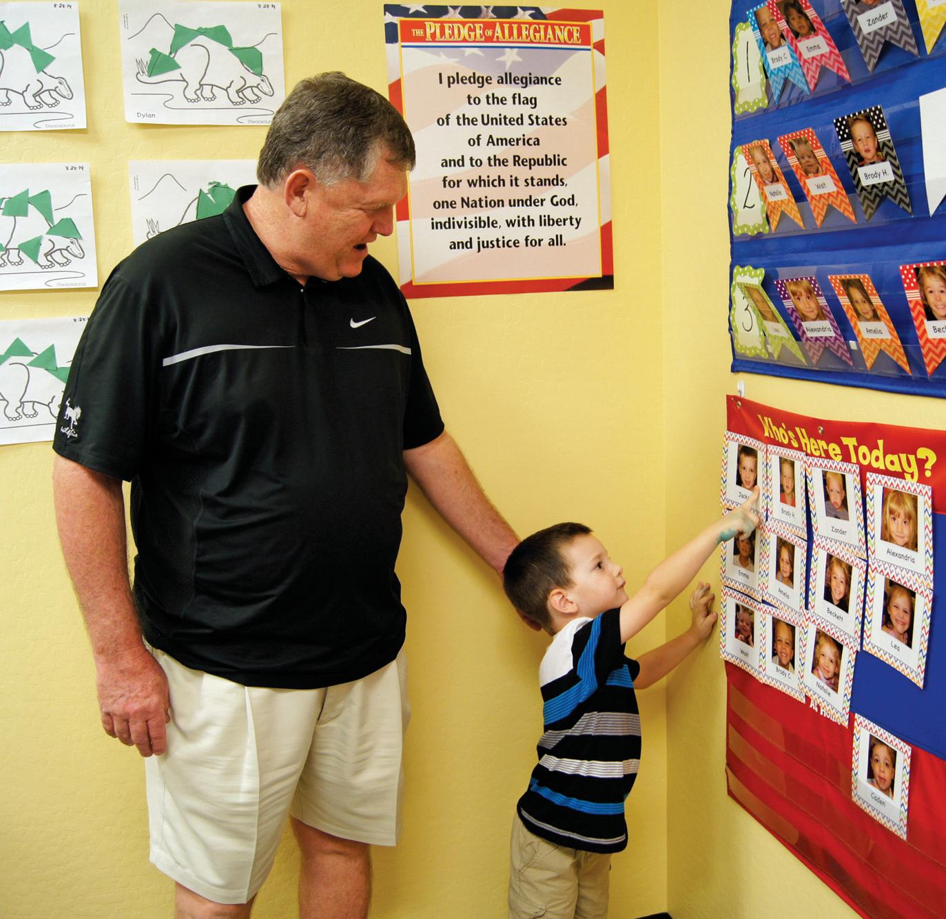 LOOK, GRANDPA: Three-year-old Jackson Milton shows his grandpa his classroom. Wee Blessings Preschool and Academy recently celebrated Grandparents Day with an event themed “Grandparents and Goldfish.” Grandparents visited the classroom, and children presented them with handmade gifts. For more information, call (480) 634-4788 or visit www.weeblessingspreschool.com. Wee Blessings is at 1751 E. Queen Creek Rd., Chandler. Submitted photo