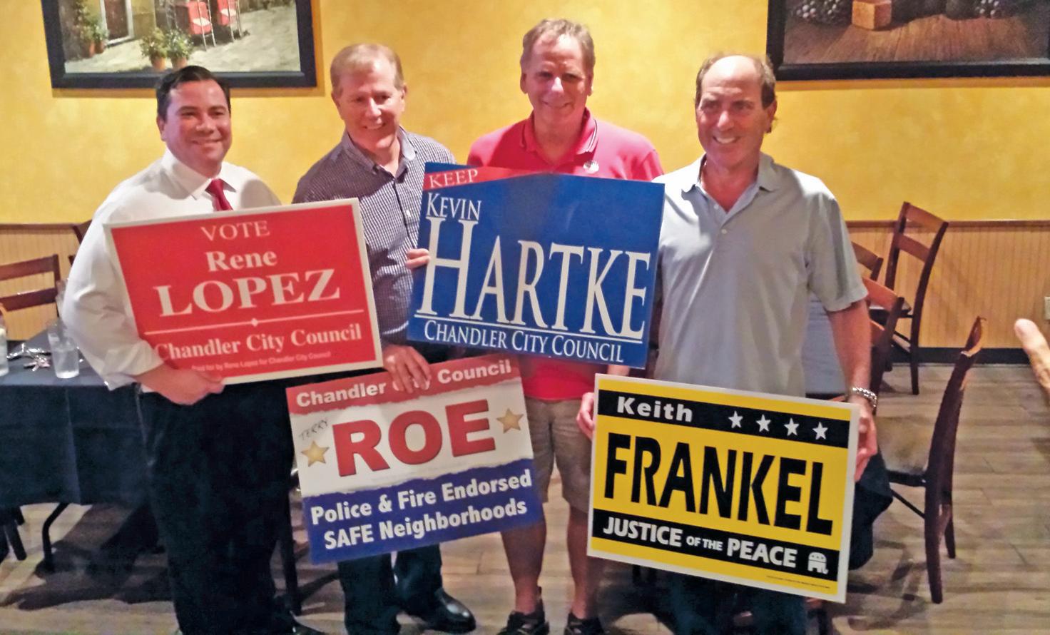 Hartke, Roe and Lopez are endorsed by the Legislative District 17 Republican Party. The trio held its election night festivities together at Flordino’s Pizza and Pasta, owned by Lopez’s campaign chairman and outgoing Councilman Jeff Weninger. J.D. Mesnard and Weninger won places on the ballot for Legislative District 17 House of Representatives in the November general election.