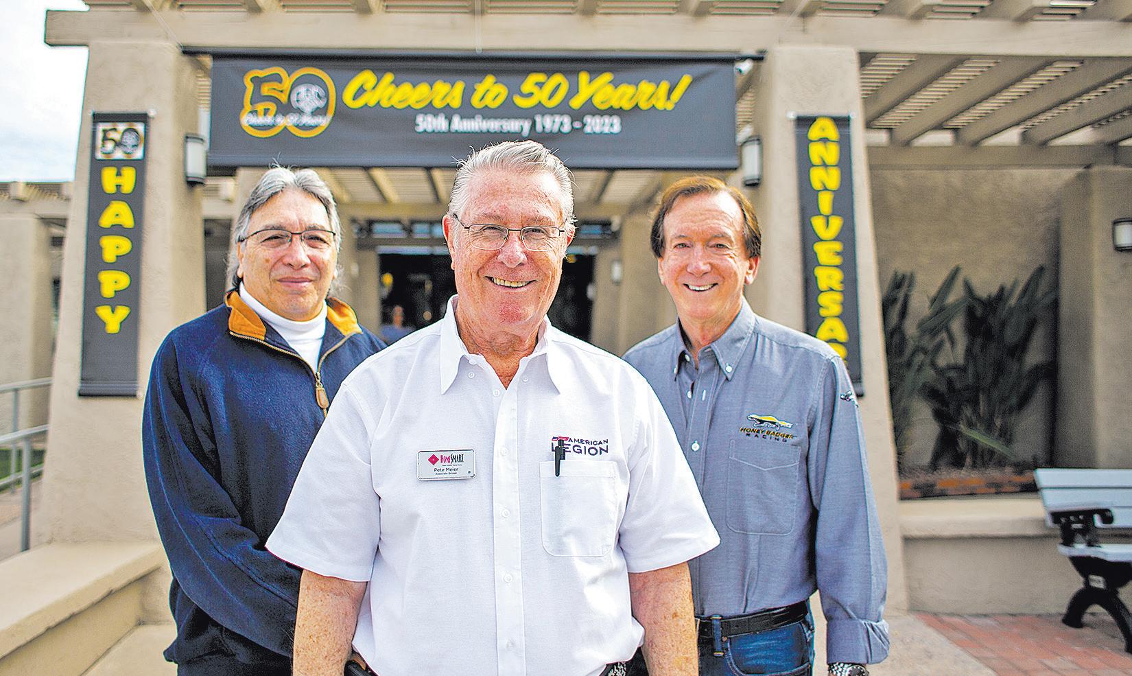 At 2 p.m. Saturday, Jan. 21, at the Ahwatukee Recreation Center, Ahwatukee historian Marty Gibson, right, will facilitate the first of his three discussions with some of the people who were Ahwatukee’s early “settlers.” Two of those people are Sensei Rick Savagian, left, founder of and head instructor at Mountainside Martial Arts and Pete Meier, former vice president of sales for Pressley Development Co.. Savagian is one of the featured guests at this Saturday’s presentation. Meier, who will be a guest speaker at the second installment, is a Realtor and commander of American Legion Post 64, Ahwatukee’s only formal veterans organization. The series is part of the ARC’s 50th anniversary celebration. (David Minton/AFN Staff Photographer) see ARC page 8