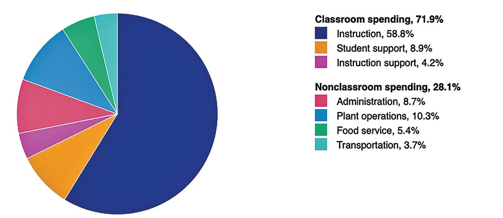 The largest involves instruction, which it defines as the cost of “teachers, teachers’ aides, substitute teachers, graders, guest lecturers, instructional supplies and aids, field trips, athletics, co-curricular activities, and tuition.”