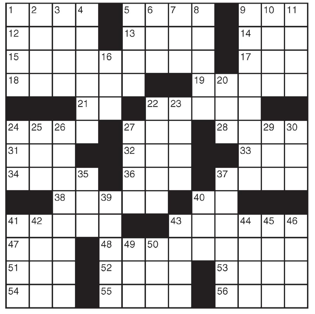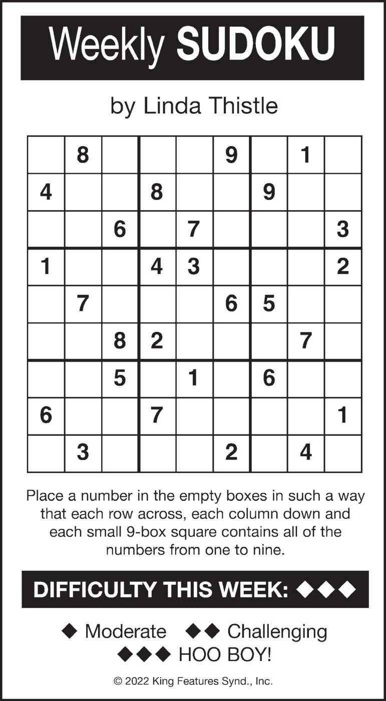 46 AHWATUKEE FOOTHILLS NEWS | OCTOBER 5, 2022GET OUT ACROSS 1 Black, in verse 5 Galoots 9 Stitch 12 Oompah band member 13 One 14 La-la lead-in 15 Post-WWII period 17 Texas tea 18 Hot and humid 19 “Haystacks” painter 21 Infinitive part 22 Follow 24 Merit badge holder 27 Chopper 28 Fury 31 Mom’s mate 32 Morsel 33 “Gosh!” 34 Dieter’s target 36 UFO fliers 37 Phone inventor 38 Small change 40 Rocky Balboa’s greeting 41 Words to live by 43 Sounded content 47 Grazing land 48 Period before one’s golden years 51 “Life of Pi” director Lee 52 “Dream on!” 53 “East of Eden” son 54 Born abroad? 55 Feet, slangily 56 Minus DOWN 1 LAX guesses 2 Cigar remnant 3 Slender woodwind 4 “Broadway Joe” 5 Charlie Brown’s psychiatrist 6 Italian article 7 Showbiz job 8 Rose parts 9 Prehistoric period 10 Canal of song 11 Poet Whitman 16 “As I see it,” in a text 20 Owned by us 22 Departs 23 Tennis barriers 24 Beach lotion letters 25 MSN alternative 26 Period that started with Sputnik 27 Help a hood 29 Solidify 30 Slithery fish 35 Foundation 37 Northern 39 Wanderer 40 Actor Brynner 41 Family 42 Actress Russo 43 Shareable PC files 44 Exceptional 45 Swelled heads 46 Cozy rooms 49 Equal (Pref.) 50 Use a shovel Sudoku King Crossword PUZZLES ANSWERS on page 47