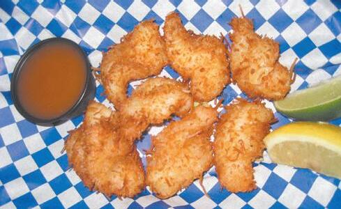 Top: Fish tacos Left: Coconut shrimp