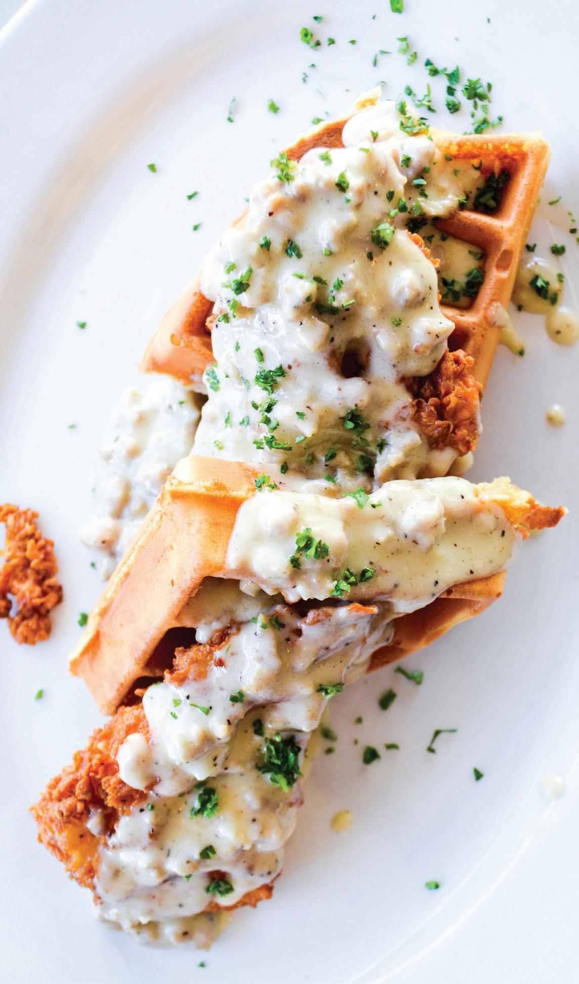Over Easy o ers a di erent take on a typical wa e dish in its Golden Wa e Dogs. As seen on Food Network’s “ e Best ing I Ever Ate,” hearty sausage links are dipped in vanilla wa e ba er and fried until golden brown. Served on a stick makes them easy and fun to dunk in syrup. Over Easy also prepares chicken and wa e served with a blend of hot sauce and real maple syrup. Old-fashioned malted wa es also grace the menu for customers wanting a classic.