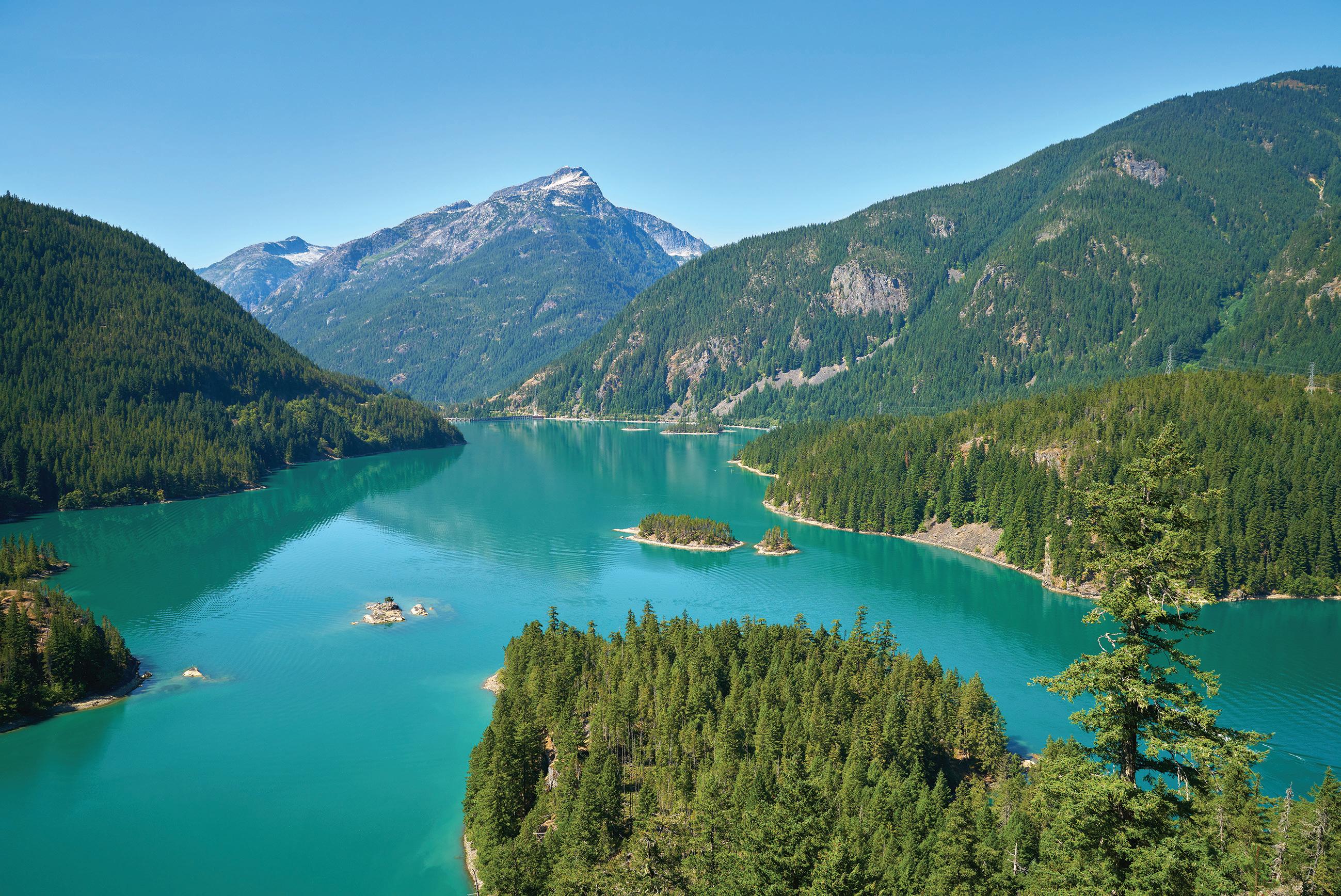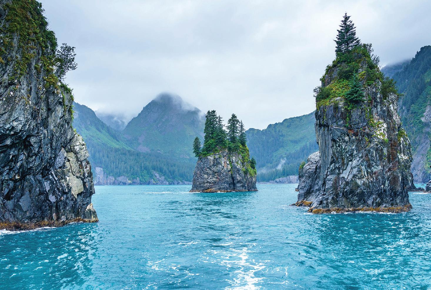 Tree-covered rocks jut out of the crystal blue waters at Kenai Fjords National Park.