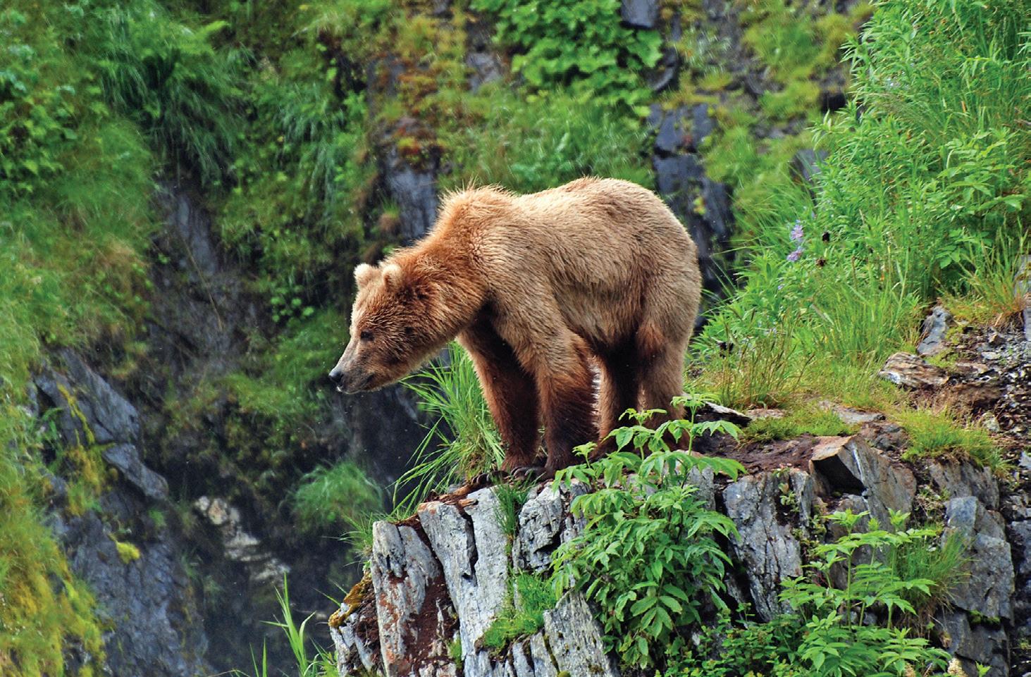 A brown bear stands surrounded by lush greenery on one of Alaska’s many islands.