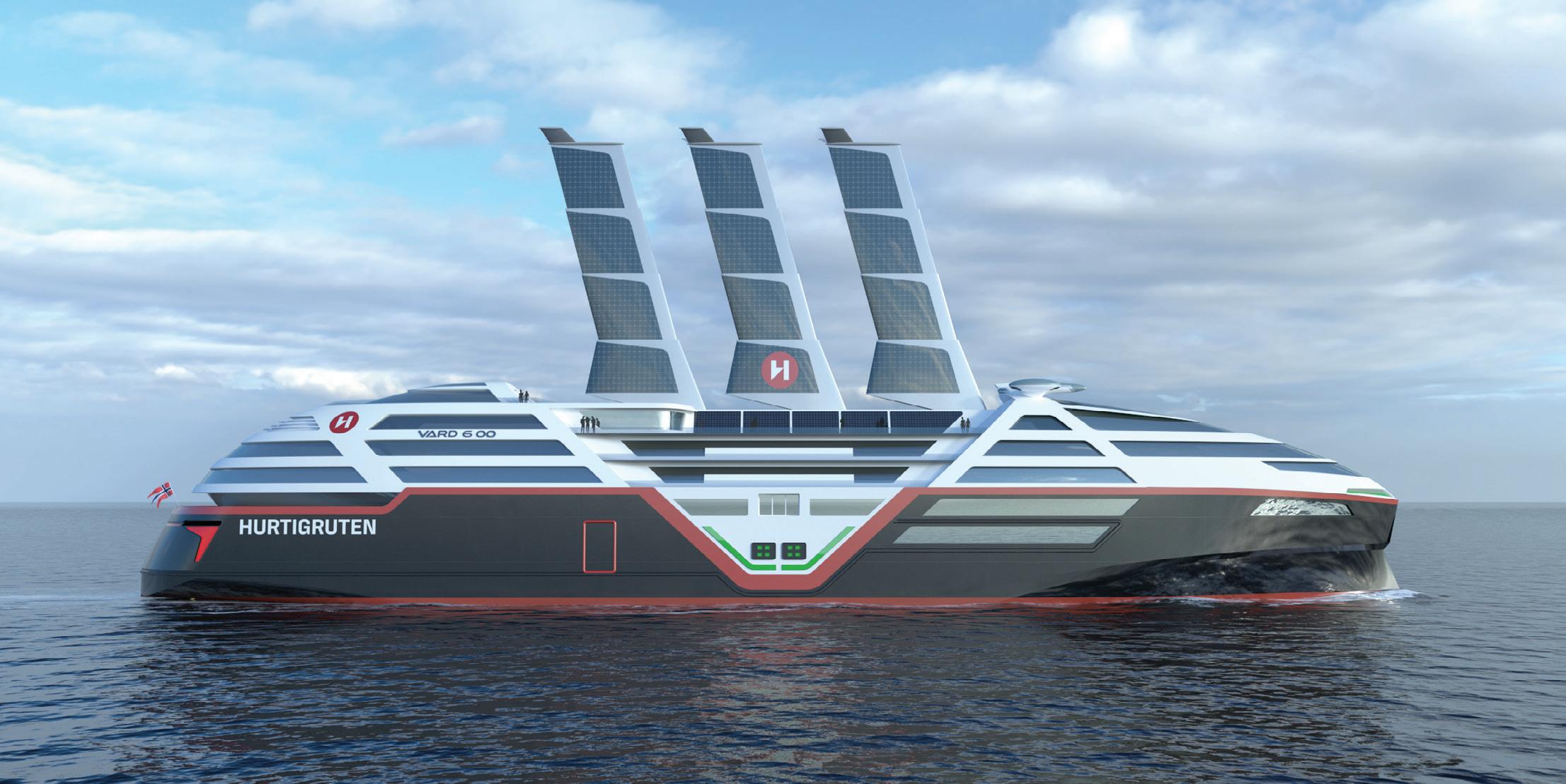 A rendering of Hurtigruten’s Sea Zero Ship with its sails fully extended