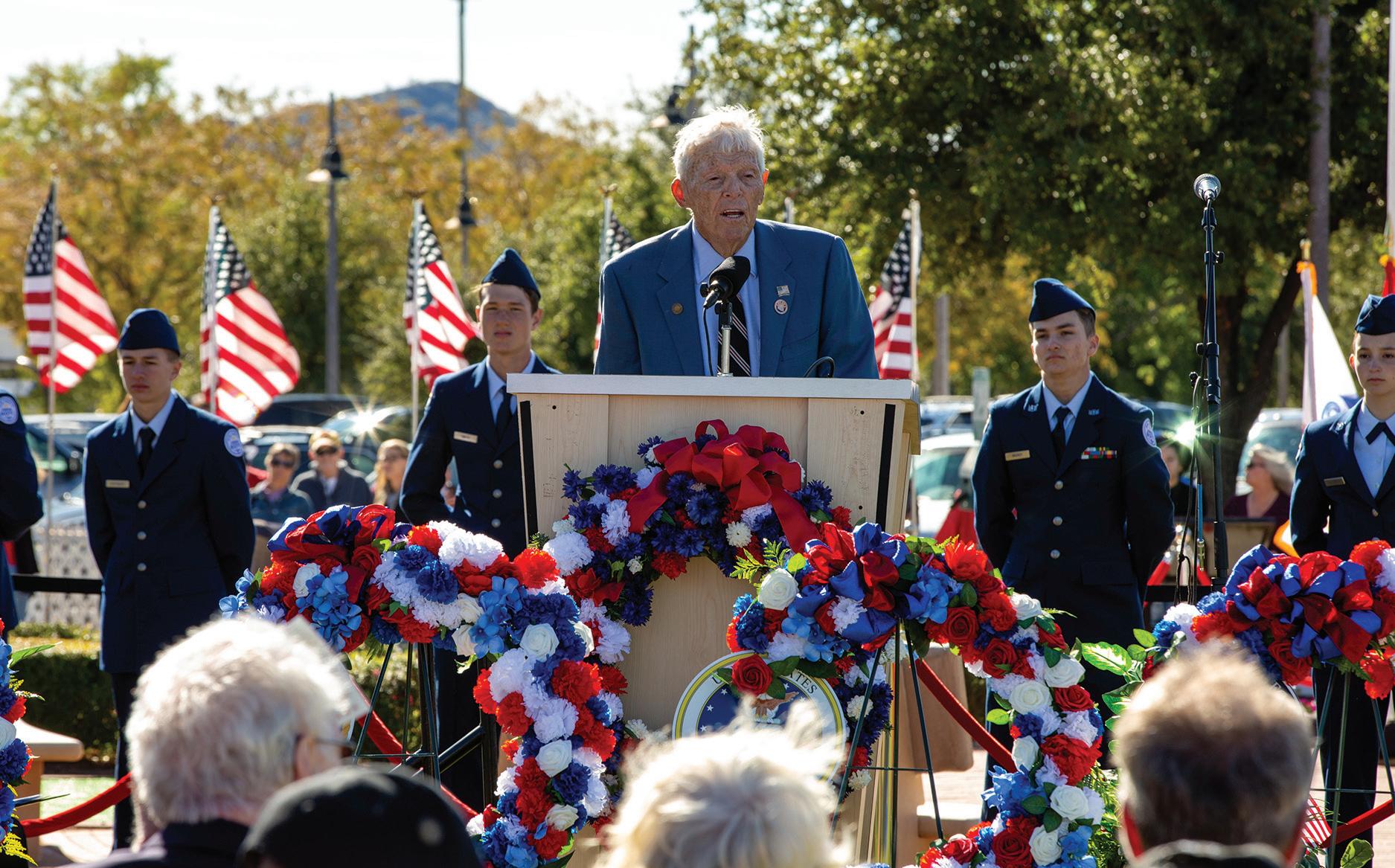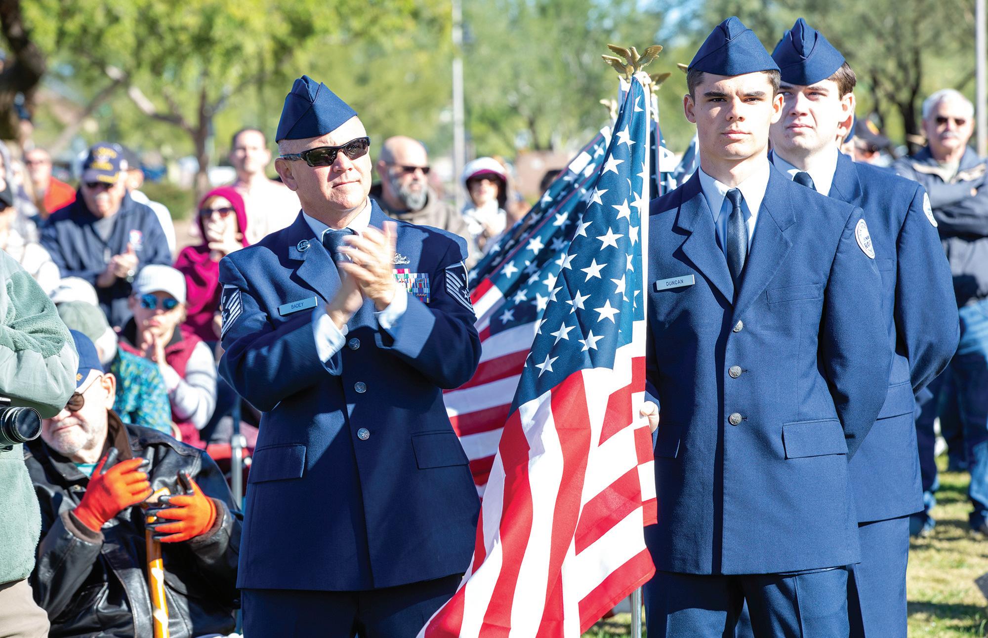 1 - Wreaths represent the six branches of the military Army, Marines, Navy, Air Force, Coast Guard and Space Force. 2 - ROTC cadets from Sandra Day O’Connor High School stand watch at the Anthem Veterans Memorial. 3 - ProMusica Arizona Chorale and Orchestra perform. 4 - Master Sgt. Christopher Villaneuva honors veterans. 5 - Veteran Dennis Burns attends the ceremony. 6 - Lt. Col. Amber Cargile gives a historical perspective. 7 - ProMusica Arizona Chorale and Orchestra perform. 8 - Petty Officer 1st Class Machinery Repairman Mary Lou Spicer gives the invocation. 9 - ROTC cadets from Sandra Day O’Connor High School stand watch. 10 - ROTC cadets from Sandra Day O’Connor High School stand watch. 11 - Sgt. 1st Class Broderick De Armas, Sgt. 1st Class Kyle David and Staff Sgt. Luis Beltran attend. 12 - Keynote address given by Col. Thomas H. Kirk Jr., who was instrumental in establishing the memorial. 13 - Lisa Jones pays tribute to veterans. 14 - Flags fly. 15 - ROTC cadets from Sandra Day O’Connor High School stand watch.