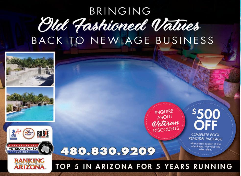 24 GILBERT SUN NEWS | JANUARY 1, 2023 BUSINESS ANSWERS TO PUZZLES ABOVE Thank you for voting us an Ahwatukee’s “Best Of” Pool Service Company 2011, 2012, 2013, 2014, 2015, 2016, 2017, 2018, 2019, 2020, 2021! Ahwatukee Owned & Operated Licensed, Bonded & Insured ROC# 272001 Pool Resurfacing Experts Specializing in POOL SERVICE, MAINTENANCE & REPAIR SEE STORE FOR DETAILS Is Your Pool In Need of a Makeover? We’re the Pool Resurfacing Experts! L et u s h e lp y o u c reat e t h e p o o l o f y o u r d rea m s! BEFORE AFTER BRING IN A WATER SAMPLE FOR A FREE ANALYSIS Ahwatukee! 10 % OFF Tile Cleaning Expires December 31, 2022 Ahwatukee! BESTOF 2019 602-546-POOL (7665) www.barefootpoolman.com 384 W Cullumber Avenue Gilbert, AZ 85233 > edwardjones.com | Member SIPC Bank-issued, FDIC-insured APY* % * Annual Percentage Yield (APY) effective 11/01/22. CDs offered by Edward Jones are bank-issued and FDIC-insured up to $250,000 (principal and interest accrued but not yet paid) per depositor, per insured depository institution, for each account ownership category. Please visit www.fdic.gov or contact your financial advisor for additional information. Subject to availability and price change. CD values are subject to interest rate risk such that when interest rates rise, the prices of CDs can decrease. If CDs are sold prior to maturity, the investor can lose principal value. FDIC insurance does not cover losses in market value. Early withdrawal may not be permitted. Yields quoted are net of all commissions. CDs Michael Kreitinger, CRPS™ Financial Advisor 3011 S Lindsay Rd Ste 103 Gilbert, AZ 85295 480-899-3476 4.10 6-month We're more than just a great rate > edwardjones.com | Member SIPC Bank-issued, FDIC-insured APY* % * Annual Percentage Yield (APY) effective 11/01/22. CDs offered by Edward Jones are bank-issued and FDIC-insured up to $250,000 (principal and interest accrued but not yet paid) per depositor, per insured depository institution, for each account ownership category. Please visit www.fdic.gov or contact your financial advisor for additional information. Subject to availability and price change. CD values are subject to interest rate risk such that when interest rates rise, the prices of CDs can decrease. If CDs are sold prior to maturity, the investor can lose principal value. FDIC insurance does not cover losses in market value. Early withdrawal may not be permitted. Yields quoted are net of all commissions. CDs Michael Kreitinger, CRPS™ Financial Advisor 3011 S Lindsay Rd Ste 103 Gilbert, AZ 85295 480-899-3476 4.10 6-month We're more than just a great rate > edwardjones.com | Member SIPC Bank-issued, FDIC-insured APY* % * Annual Percentage Yield (APY) effective 11/01/22. CDs offered by Edward Jones are bank-issued and FDIC-insured up to $250,000 (principal and interest accrued but not yet paid) per depositor, per insured depository institution, for each account ownership category. Please visit www.fdic.gov or contact your financial advisor for additional information. Subject to availability and price change. CD values are subject to interest rate risk such that when interest rates rise, the prices of CDs can decrease. If CDs are sold prior to maturity, the investor can lose principal value. FDIC insurance does not cover losses in market value. Early withdrawal may not be permitted. Yields quoted are net of all commissions. CDs require the distribution of interest and do not allow interest to compound. CDs offered through Edward Jones are issued by banks and thrifts nationwide. All CDs sold by Edward Jones are registered with the Depository Trust Corp. (DTC). FDI-1916M-A © 2022 EDWARD D. JONES & CO., L.P. ALL RIGHTS RESERVED. AECSPAD Michael Kreitinger, CRPS™ Financial Advisor 3011 S Lindsay Rd Ste 103 Gilbert, AZ 85295 480-899-3476 4.10 6-month We're more than just a great rate > edwardjones.com | Member SIPC Bank-issued, FDIC-insured APY* % * Annual Percentage Yield (APY) effective 11/01/22. CDs offered by Edward Jones are bank-issued and FDIC-insured up to $250,000 (principal and interest accrued but not yet paid) per depositor, per insured depository institution, for each account ownership category. Please visit www.fdic.gov or contact your financial advisor for additional information. Subject to availability and price change. CD values are subject to interest rate risk such that when interest rates rise, the prices of CDs can decrease. If CDs are sold prior to maturity, the investor can lose principal value. FDIC insurance does not cover losses in market value. Early withdrawal may not be permitted. Yields quoted are net of all commissions. CDs require the distribution of interest and do not allow interest to compound. CDs offered through Edward Jones are issued by banks and thrifts nationwide. All CDs sold by Edward Jones are registered with the Depository Trust Corp. (DTC). FDI-1916M-A © 2022 EDWARD D. JONES & CO., L.P. ALL RIGHTS RESERVED. AECSPAD Michael Kreitinger, CRPS™ Financial Advisor 3011 S Lindsay Rd Ste 103 Gilbert, AZ 85295 480-899-3476 4.10 6-month We're more than just a great rate > edwardjones.com | Member SIPC Bank-issued, FDIC-insured APY* % * Annual Percentage Yield (APY) effective 11/01/22. CDs offered by Edward Jones are bank-issued and FDIC-insured up to $250,000 (principal and interest accrued but not yet paid) per depositor, per insured depository institution, for each account ownership category. Please visit www.fdic.gov or contact your financial advisor for additional information. Subject to availability and price change. CD values are subject to interest rate risk such that when interest rates rise, the prices of CDs can decrease. If CDs are sold prior to maturity, the investor can lose principal value. FDIC insurance does not cover losses in market value. Early withdrawal may not be permitted. Yields quoted are net of all commissions. CDs require the distribution of interest and do not allow interest to compound. CDs offered through Edw