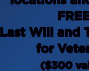Dana Law Firm and Harris Dental are offering free last wills and dental cleanings for all veterans on Monday, Nov. 11. Veterans can visit any of Dana Law Firm’s six Valley locations to receive a free will (a $300 value), and/or Harris Dental’s Chandler or Mesa locations to receive a free dental cleaning (a $200 value). Info: www. danafirm.com or www.harrisdental. com.