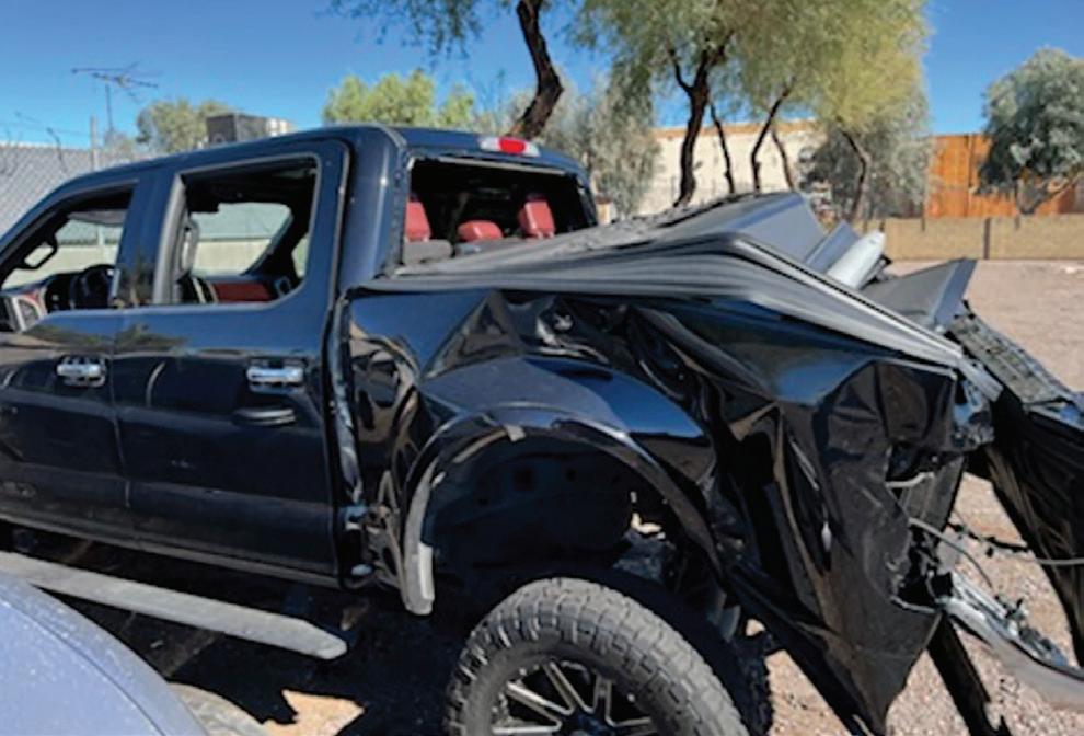 e bed of his pickup truck took the hit. It was totally crushed in.”
