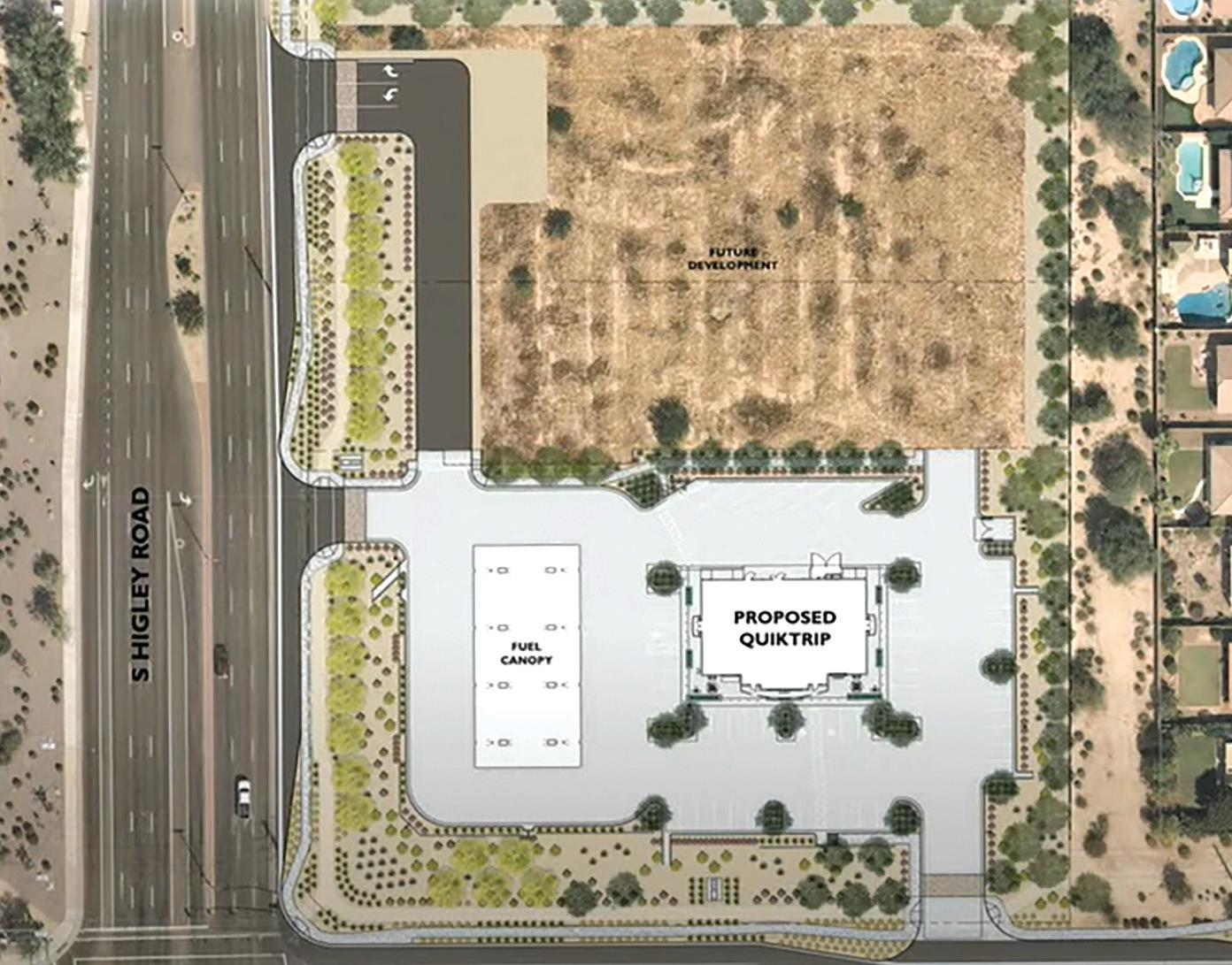 QuikTrip plans to go up on a 4.35-acre vacant parcel at the northeast corner of Higley and Riggs roads within the Seville Golf and Country Club’s planned area of development. e Planning Commission Aug. 2 unanimously approved the project’s design.