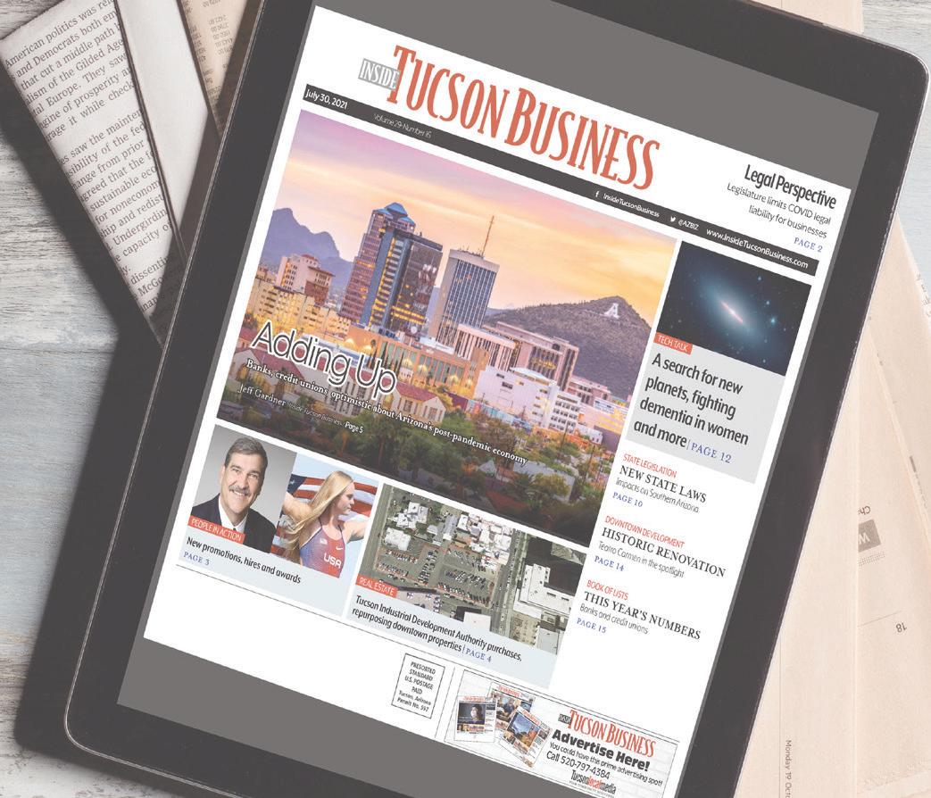To start or stop delivery of the paper, please visit: https://timespublications.com/tucson or call 480-898-7901 Inside Tucson Business is distributed by AZ Integrated Media a circulation company owned & operated by Times Media Group The public is limited to one copy per reader. For circulation services, please contact Aaron Kolodny at aaron@phoenix.org. 7225 N. Mona Lisa Road, Ste. 125 Tucson AZ 85741 Ph: 520-797-4384 www.insidetucsonbusiness.com Times Media group © 2023 Reproduction or use of material contained in Inside Tucson Business without permission of publisher is strictly prohibited. To receive your free online edition subscription, please visit: https://www.tucsonlocalmedia.com/ newsletter/signup