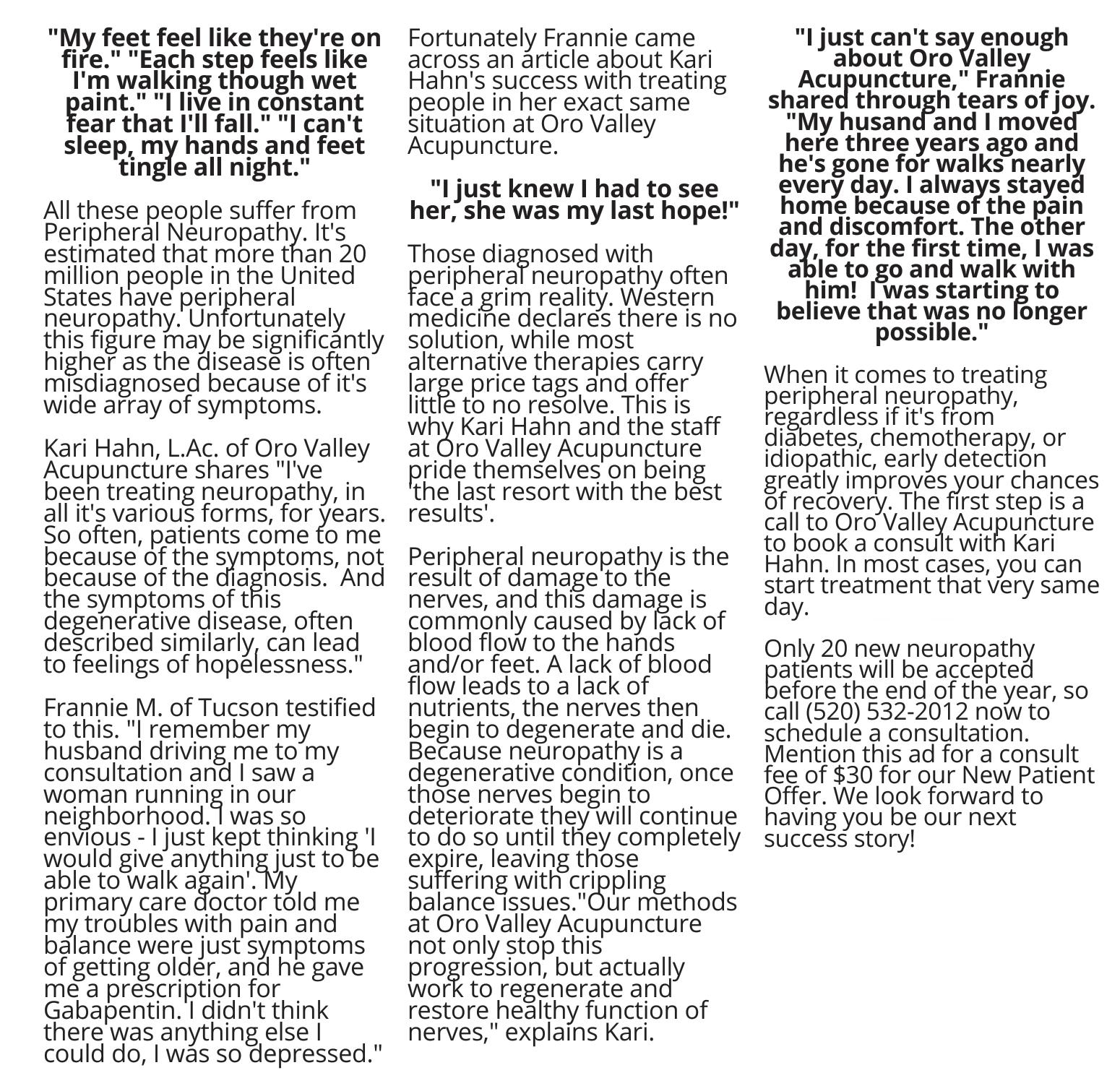 Tucson, AZ - When it comes to chronic pain and/ or neuropathy, the most common doctor-prescribed treatment is drugs like Gabapentin, Lyrica, Cymbalta, and Neurontin. The problem with anti-depressants or anti-seizure medications like these is that they offer purely symptomatic relief, as opposed to targeting and treating the root of the problem. Worse, these drugs o en trigger an onset of uncomfortable, painful, and sometimes harmful side effects.