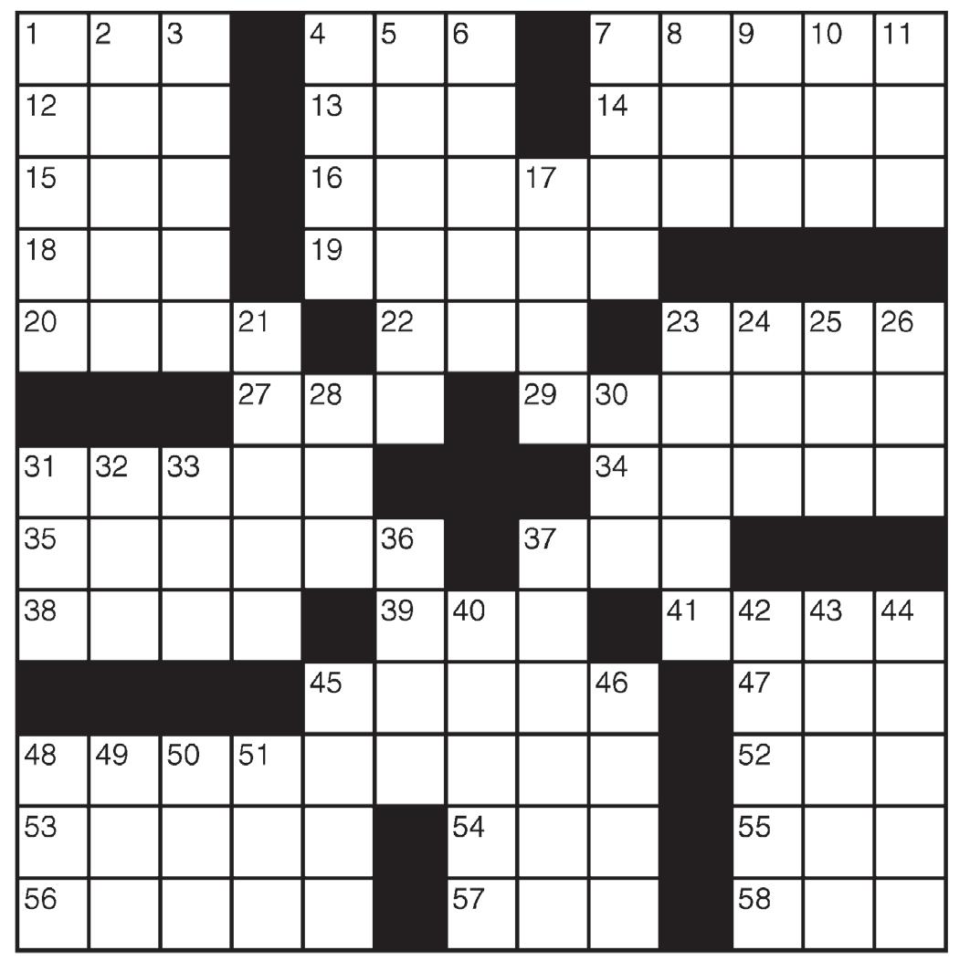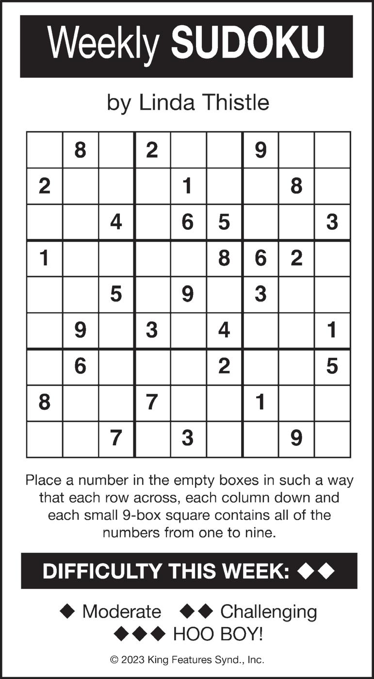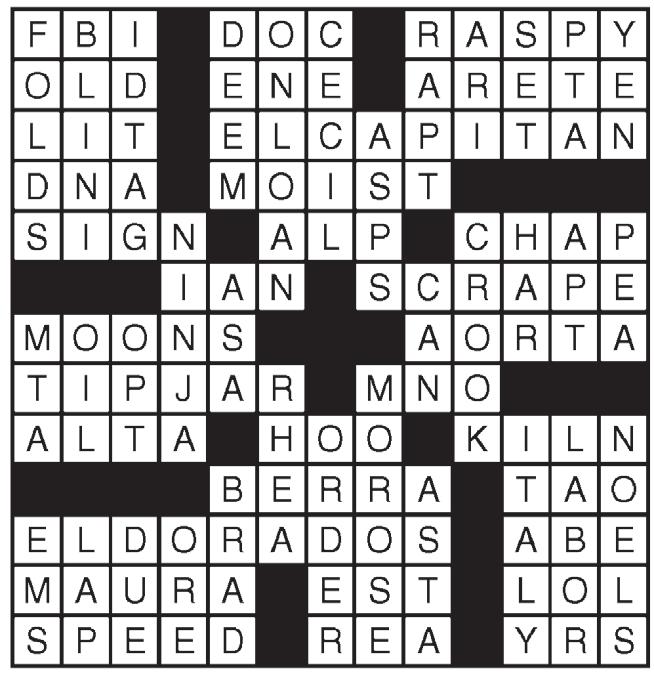 35 GET OUT THE MESA TRIBUNE | JANUARY 8, 2023 ACROSS 1 Justice Dept. agency 4 Physician’s nickname 7 Grating 12 Vintage 13 Away from WSW 14 Mountain crest 15 Set afire 16 Yosemite peak featured In “Free Solo” 18 “CSI” evidence 19 Dewy 20 Billboard 22 Swiss peak 23 Bloke 27 Author Fleming 29 Abrasion 31 Planet circlers 34 Heart line 35 Coffeehouse bill collector 37 L-P link 38 Utah ski resort 39 “Yoo- --!” 41 Pottery oven 45 Quotable Yogi 47 Eastern path 48 Bygone Cadillacs 52 Copper head? 53 Tierney of “The Affair” 54 Superlative suffix 55 Texter’s chuckle 56 Velocity 57 Irish actor Stephen 58 Decade parts (Abbr.) DOWN 1 Creates origami 2 Russian pancakes 3 Luggage attachment 4 Consider 5 Borrowed 6 Director DeMille 7 Engrossed 8 “Exodus” hero 9 Fixed 10 Sch. org 11 Hankering 17 Nile vipers 21 Martial arts warrior 23 Swindler 24 Guffaw syllable 25 Suitable 26 Green shade 28 Simile part 30 Paint container 31 1959 Kingston Trio hit 32 Texas tea 33 Choose 36 Mother of Zeus 37 Gloomy 40 Sequence 42 Tuscany setting 43 Hard work 44 Seasonal songs 45 Thin nail 46 Nick and Nora’s dog 48 Ambulance initials 49 Napkin’s place 50 Payable 51 Mine material Sudoku King Crossword PUZZLES ANSWERS on page 24 A P R E M I E R D I S T R I C T O F E D U C A T I O N A L C H O I C E L E A R N M O R E A B O U T O U R S C H O O L S W W W . G I L B E R T S C H O O L S . N E T / E X P L O R E Preschool
