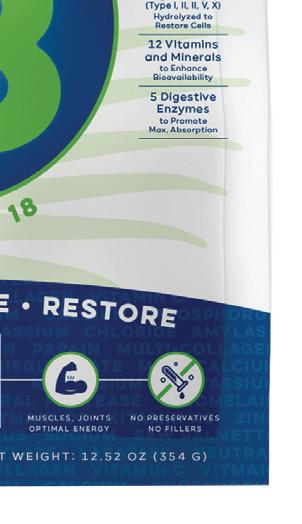“Collagen is the gift that keeps on giving. e longer you take it, the more you benefit from it,” Keely says. “ e first thing people tend to notice with the first three weeks is that their skin plumps up and starts to look softer, smoother and fuller. Going into their second month, they’ll notice their hair is stronger, their nails grow faster, and joint aches start to go away. It also offers digestive support and helps hormones, so some people lose weight as a result. It also helps to slow down the aging process.”