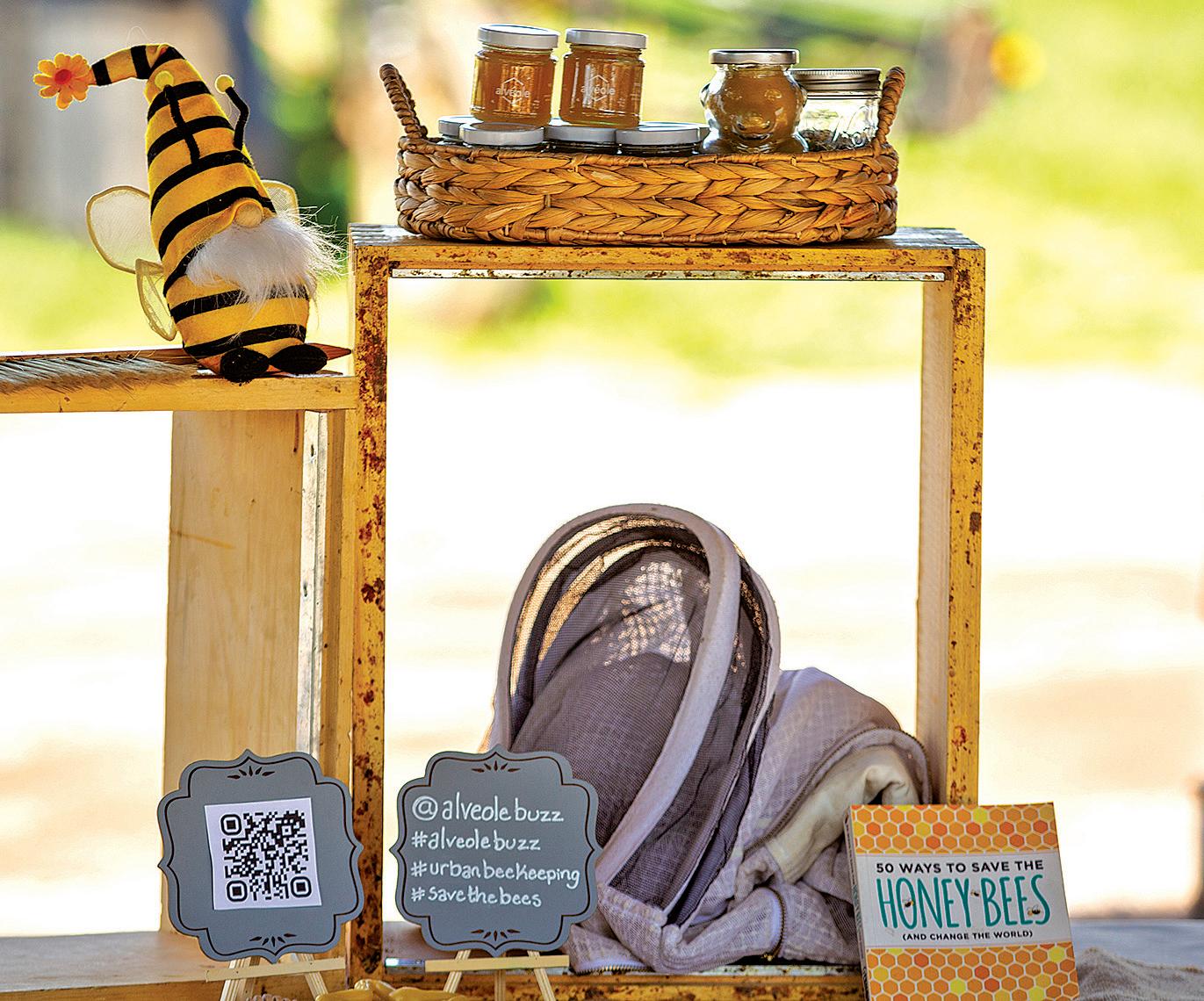 Jars of honey, beekeeper suit masks and other bee related items are used by urban beekeeper Amanda Harder as she teaches people about honeybees at Freeman Farms.
