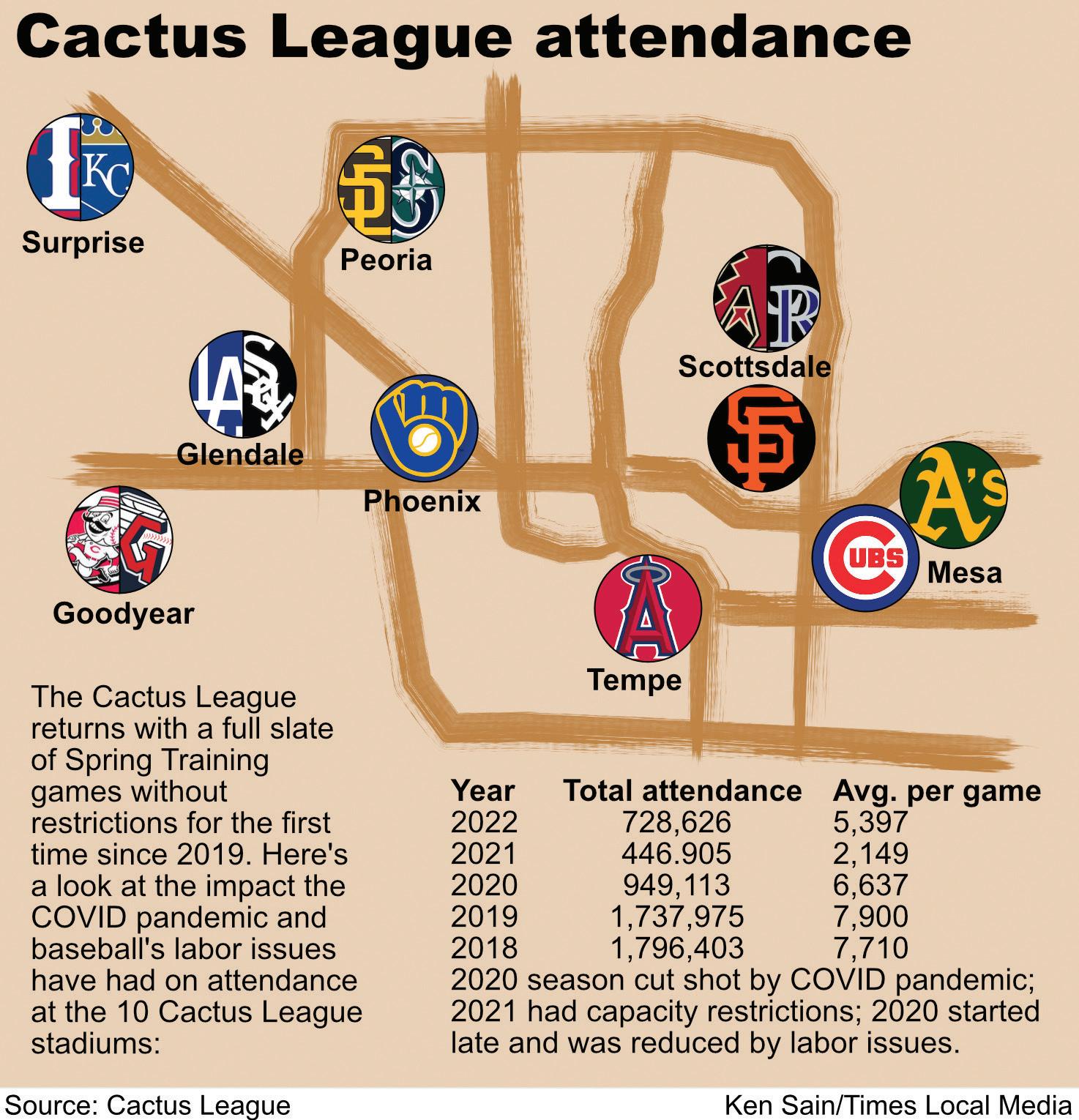 First, the COVID pandemic forced an end to nearly all sports in mid-March 2020, abruptly ending a strong Cactus League season. In 2021, stadiums had to deploy social distancing, limiting capacity to 50%. Plus, they started late and had fewer games.