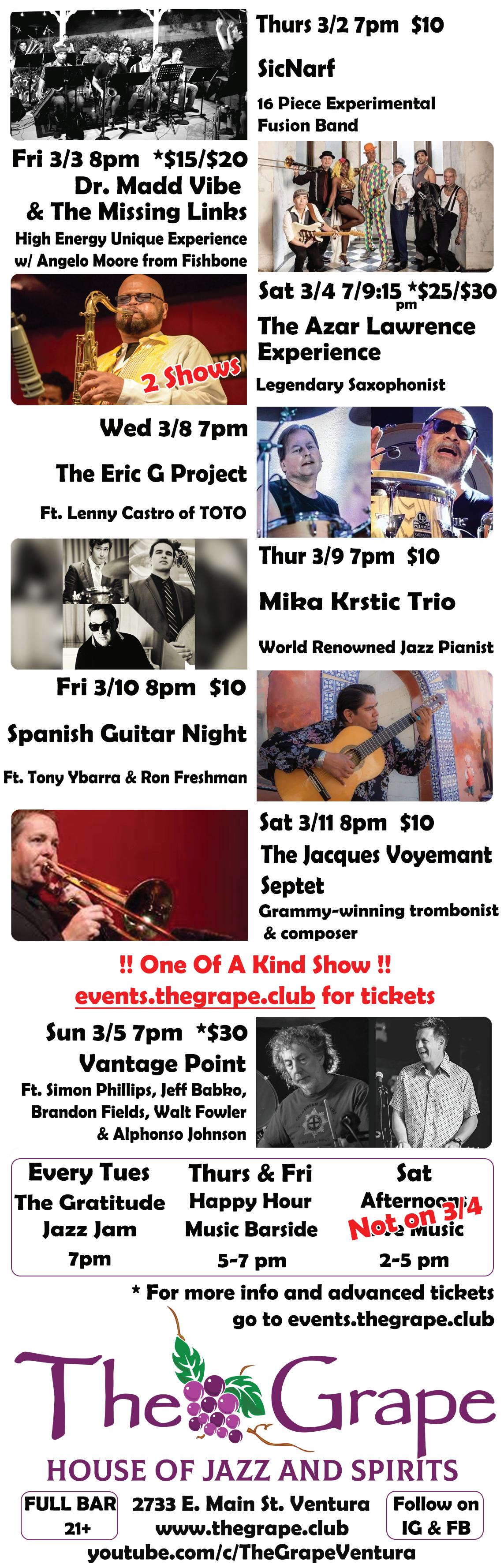 VENTURA COUNTY POETRY PROJECT Thursday, March 2, 6:30 p.m. Open mic poetry with a reading by George Yatchisin and Laure-Anne Bosselaar. Also streamed via Zoom. E.P. Foster Library, 651 E. Main St., Ventura, vcpoetryproject.org.