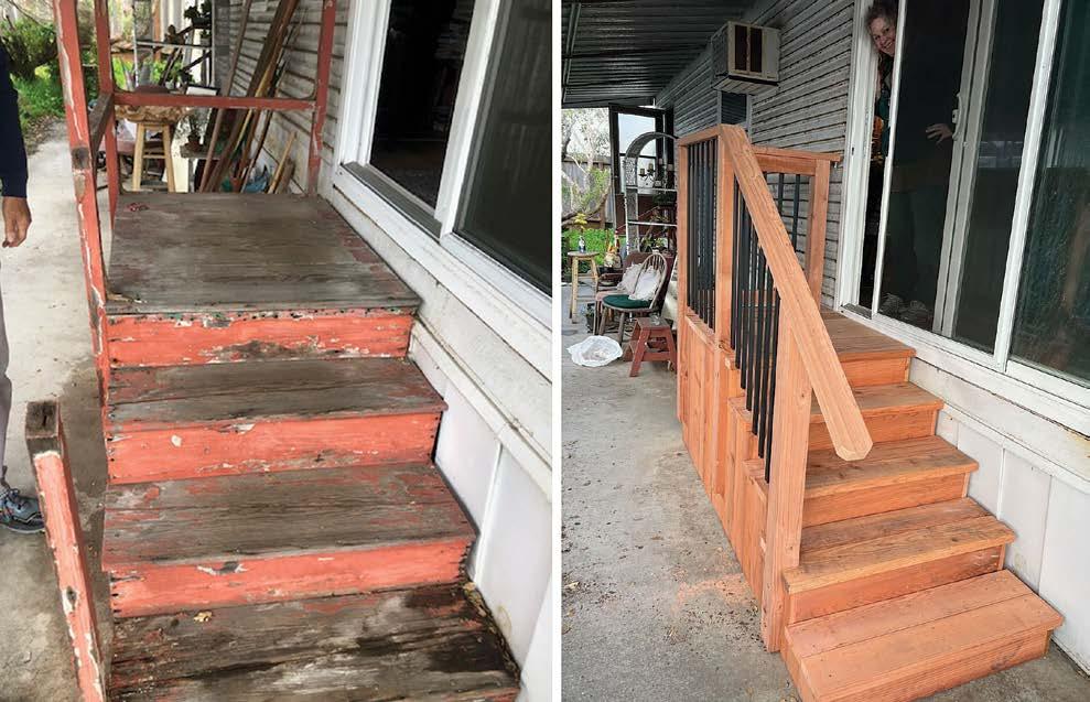 Damians Ladder began in the San Lorenzo Valley and expanded into Santa Cruz and Mid-County. The group has done a significant number of repairs in mobile home parks in Mid-County, where aging stairways can become hazardous. Installing bathroom handrails is also common. Insurance restrictions prevent volunteers from working on roofs, and due to the age