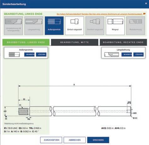 Eine zentrale Neuerung ist die Möglichkeit, Bearbeitungsvarianten und spezielle Ausstattungen online zu definieren. Bei Wellen können Ingenieure z. B. individuelle Abstufungen, Bohrungen, Gewindeenden, Nuten oder Toleranzen festlegen. Alle Maße und zulässigen Bereiche passen sich automatisch an Wellengröße und Werkstoff an. Der bisherige Prozess – Zeichnung erstellen, an Lieferanten senden, auf Angebot warten – entfällt. Stattdessen liefert das System sofort validierte Konfigurationen inklusive Preis und Lieferzeit.