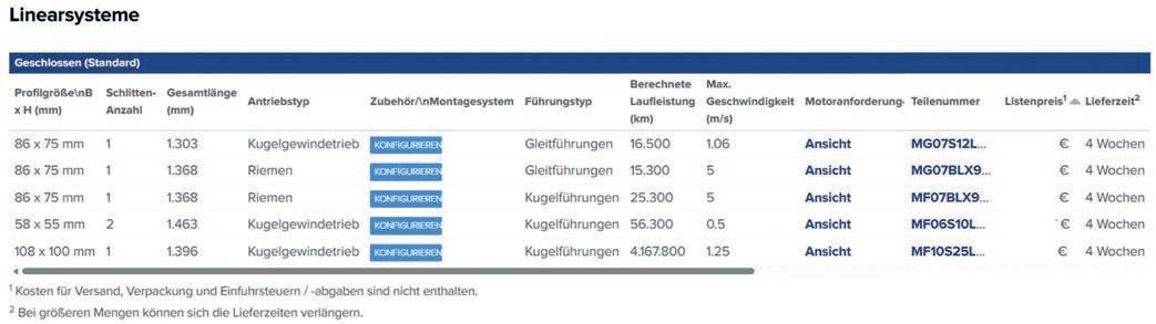 Ist eine passende Produktreihe gefunden, liefert das Tool eine Ergebnistabelle. Von dort aus können Konstrukteure Montageoptionen, Bewegungsdaten und Motor-Schnittstellen