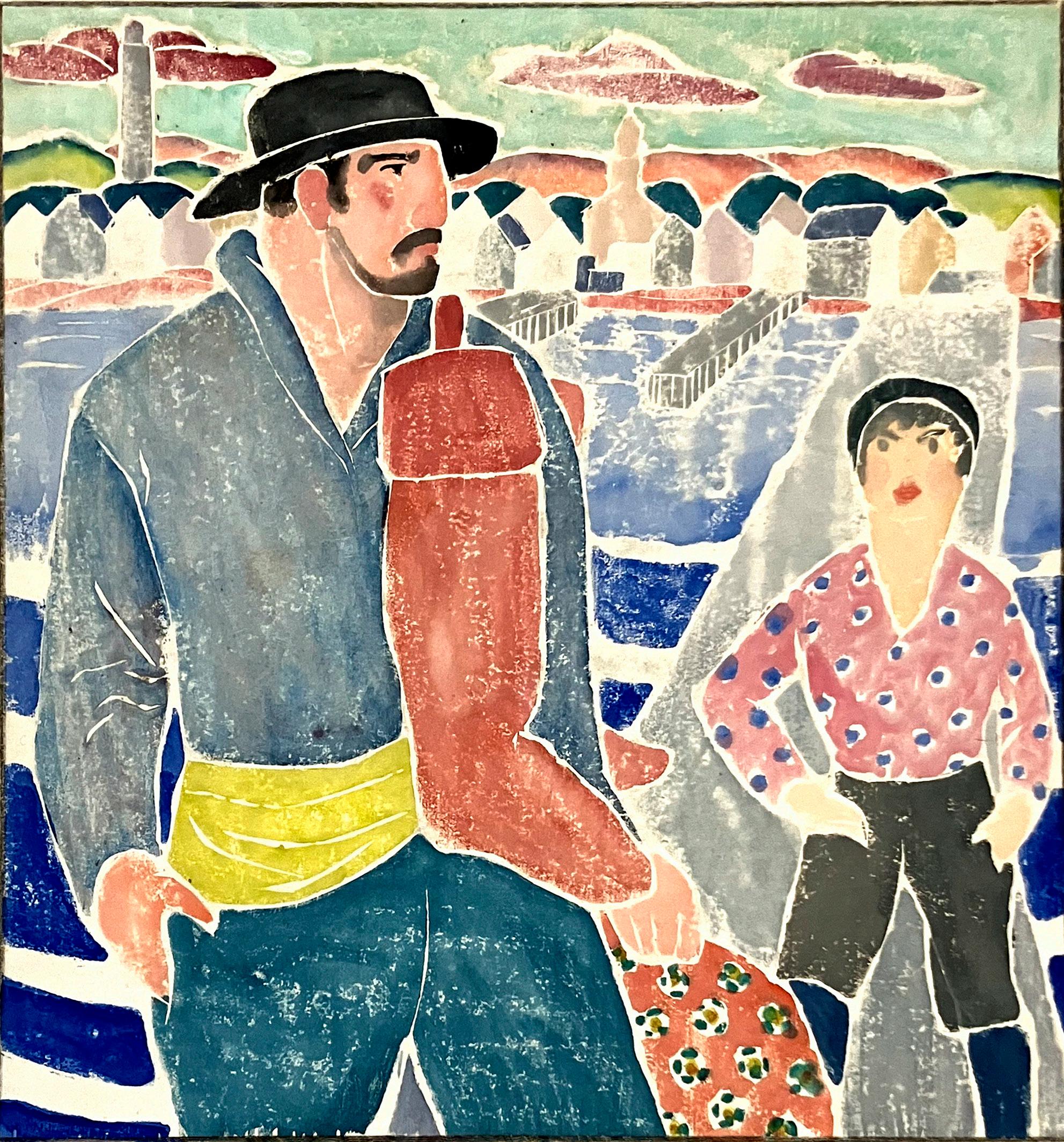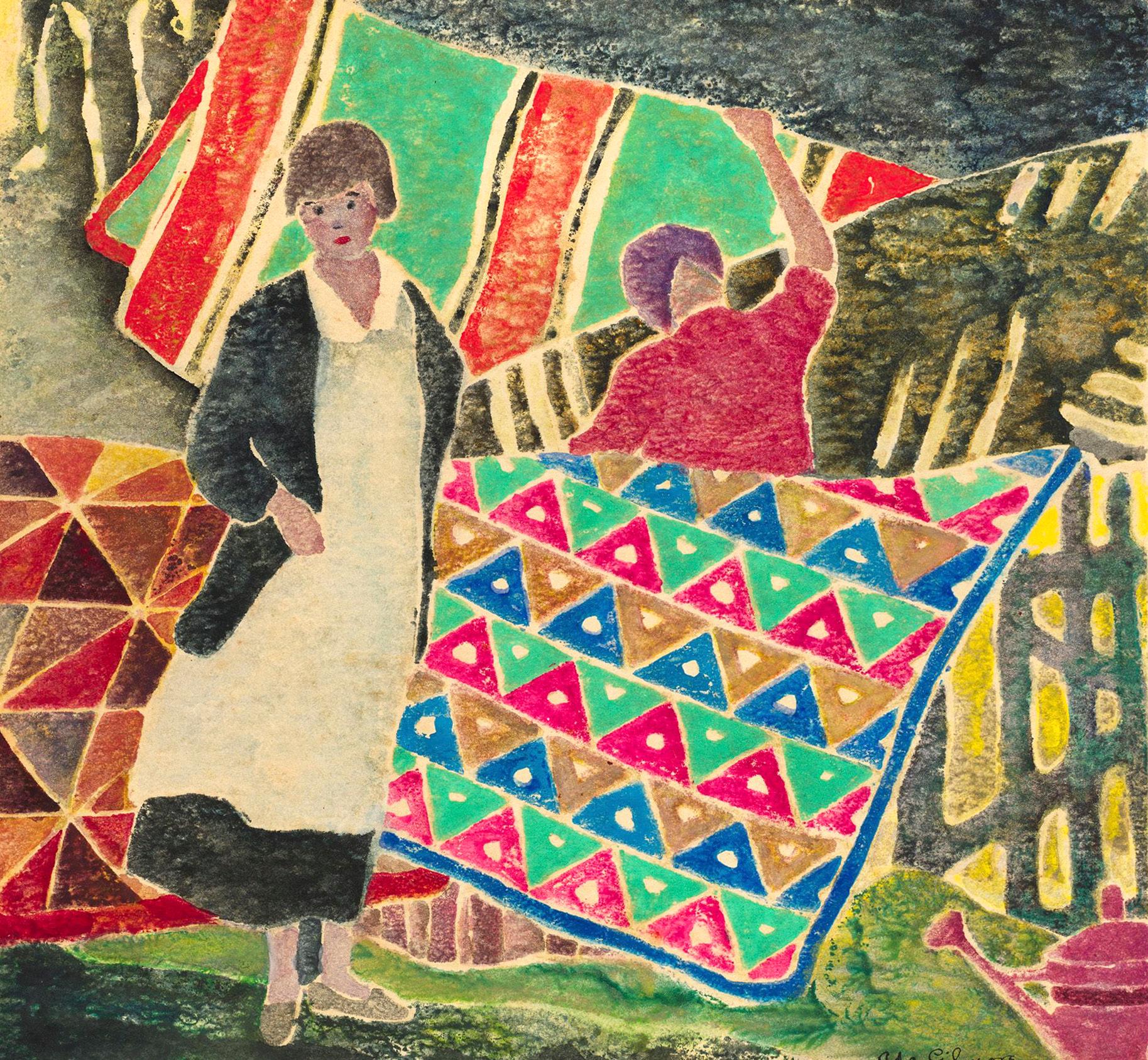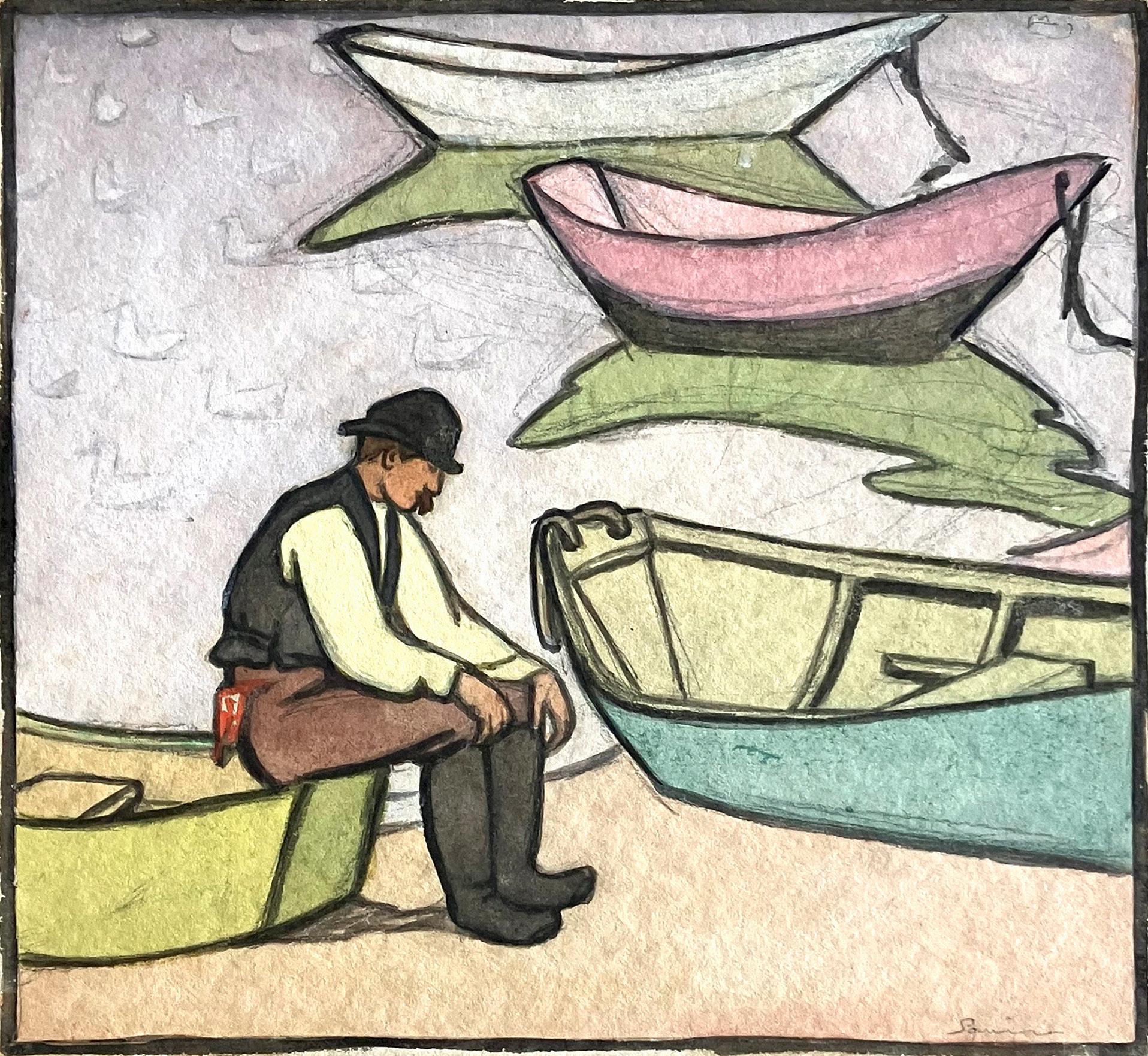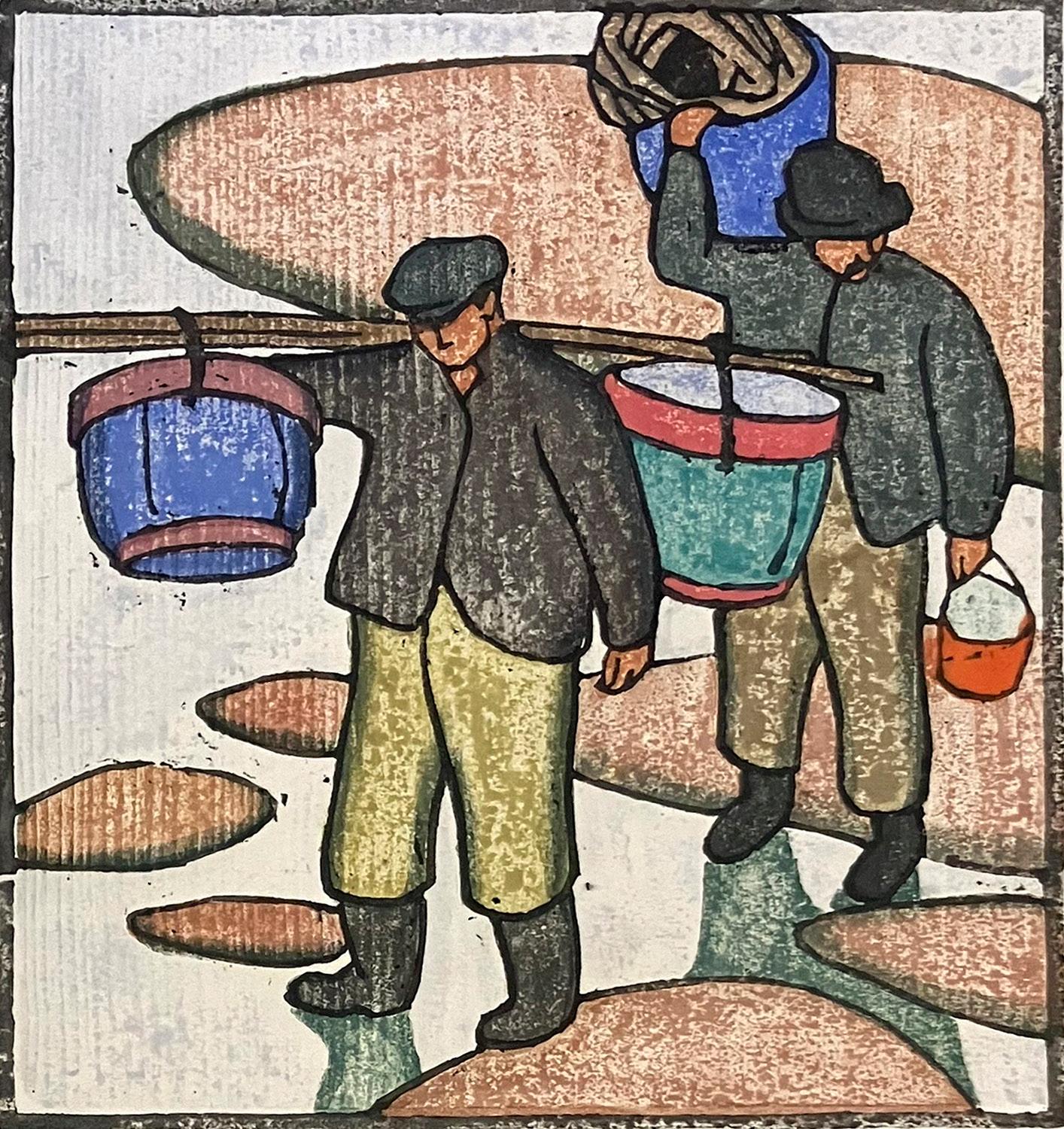 Top Row from left: Maud Squire, FishermaninGreenCoat , c. 1895-1920, watercolor and pencil on paper, 11 1/8” x 12 1/8”; Maud Squire, WinteratSea,Provincetown,c. 1895-1920, color woodcut, 11 1/8” x 12”; Maud Squire, Loadinginthe Catch,watercolor and pencil, 12” x 11”.