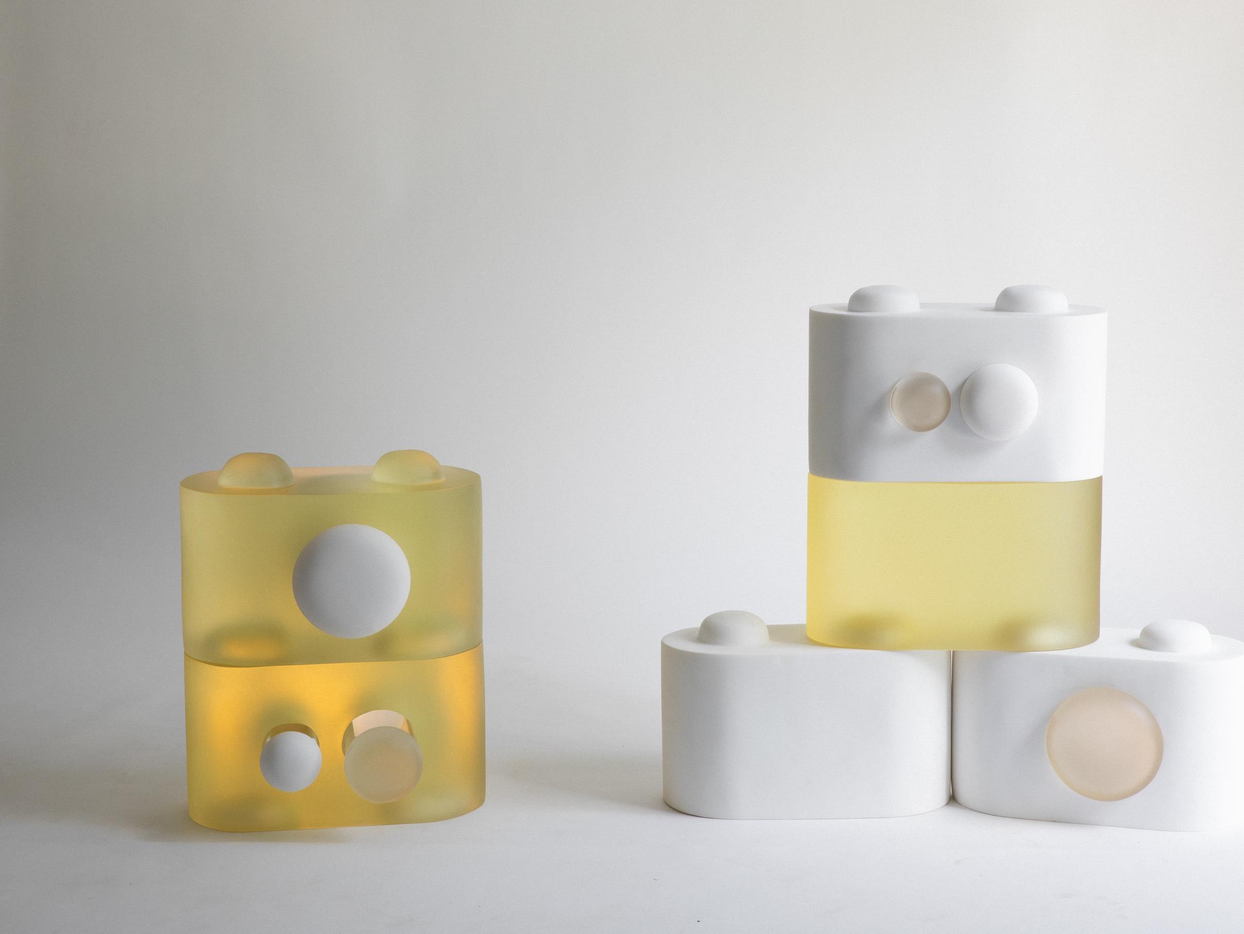 The resulting assemblages are collectible and functional items. The formation of bricks can form an undulating wall in a delicate shade, a nude hued lamp, an ocean blue welcoming desk, gentle fog colored entry table, lush green coffee table, to delicious candy colored seating… Each of these assemblages are painstakingly put together and are unique and one-of-a-kind creations.