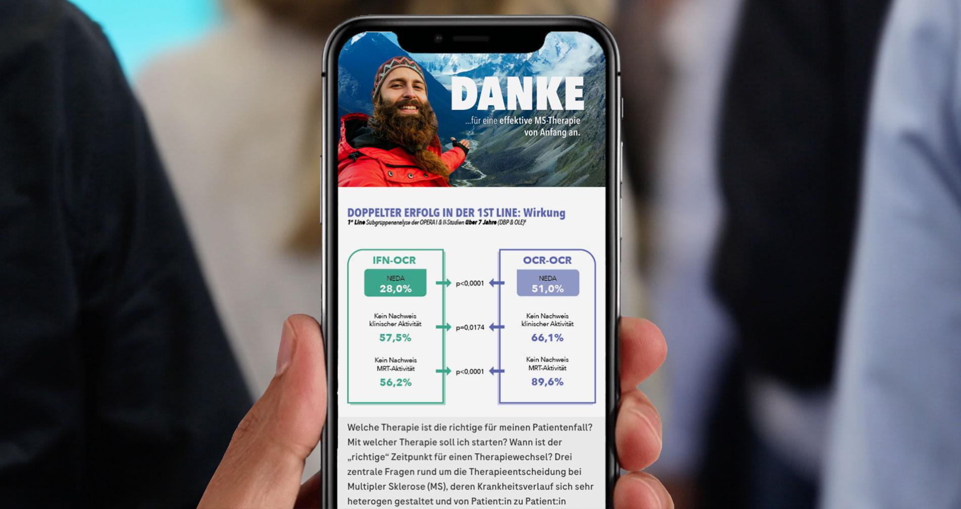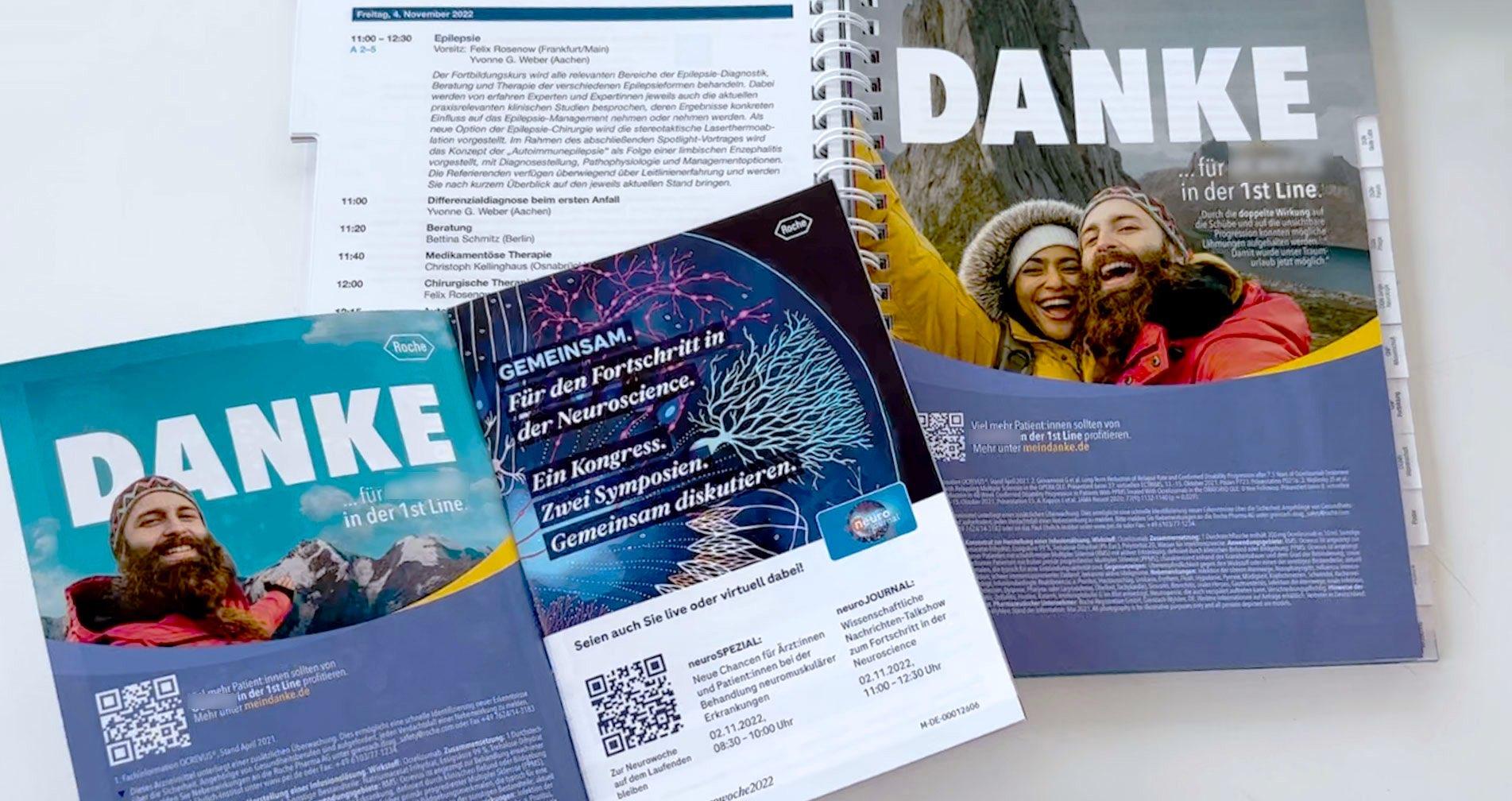 A multi-channel approach was implemented, including print, out-of-home placements at DGN, LinkedIn, newsletters, and a dedicated website. The “DANKE” initiative acknowledged the work of neurologists while subtly reinforcing key therapeutic messages. Storytelling and real-life impact narratives complemented clinical arguments to increase engagement.