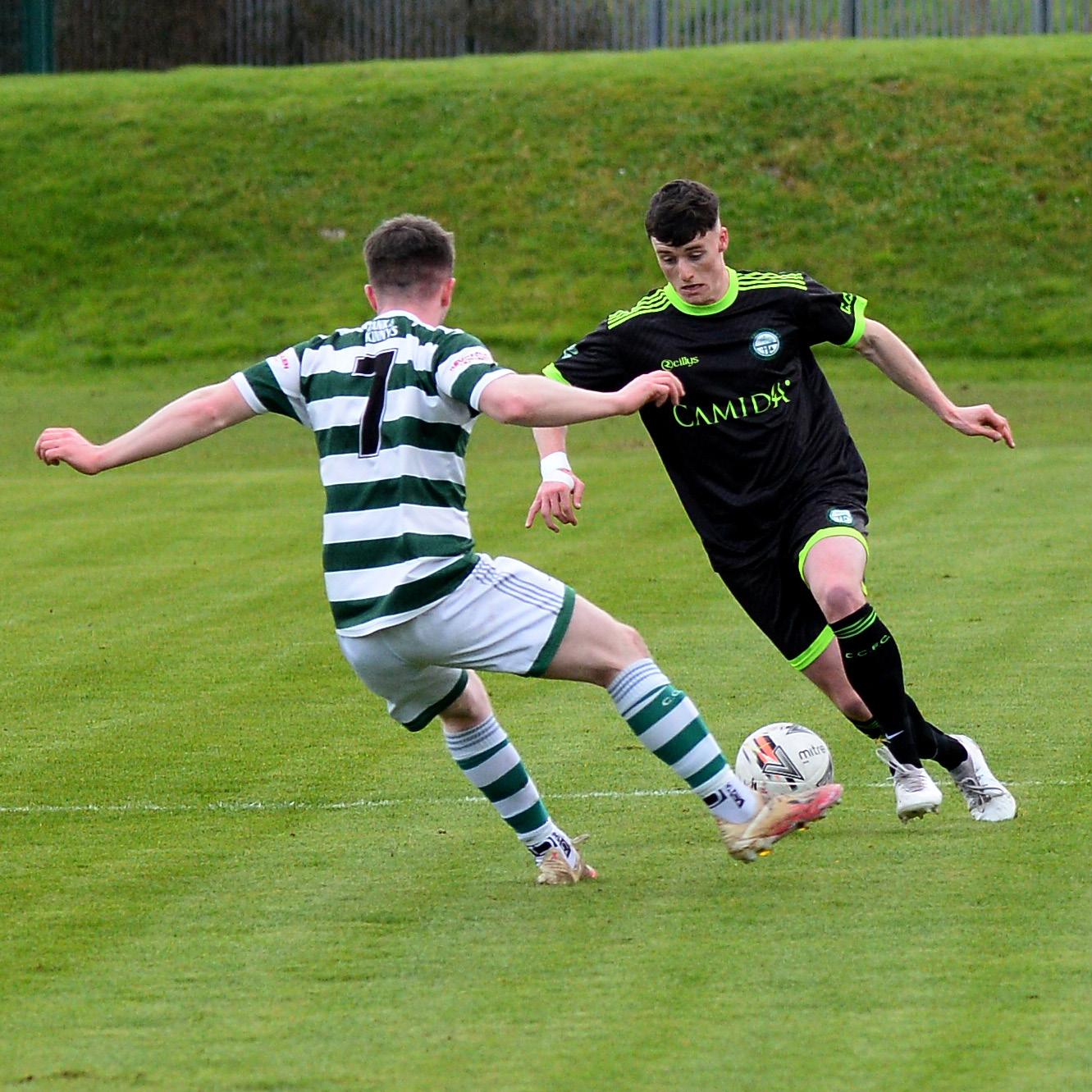 but his first-time effort was easily gathered by Hugh Doherty. The visitors came close on nineteen minutes when Luke Rudden got on the end of a cross, but his header was tipped over by Fabian Kerton in the home goal. It was end to end at this stage, though Celtic were finding it hard to create any clearcut chances against a resolute Cockhill rearguard. The visitors hit the