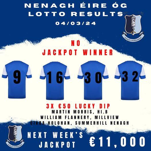 No winners of our GAA club lotto jackpot. Next weeks jackpot now stands at €7,700. Tickets just €2 available locally and online at www. locallotto.ie