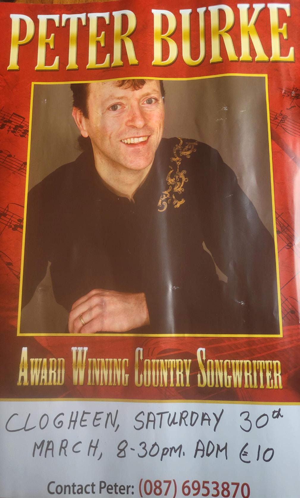 We have the brilliant Peter Burke on stage Saturday 30th March from 8.30 pm to 11pm. Admission €10 with free raffle and refreshments served. Contact PJ on 0877984929 for further information.