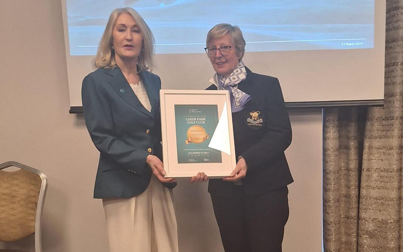 Captain Pauline Mulcahy accepted the Certificate on behalf of the Club from President of Golf Ireland for 2024, Rosemary Tully. The Gold Standard is awarded to Clubs that have minimum 30% Female representation on main Club Committees, equal access to Time Sheets and competitions, encourage more women to participate in the game, run Get Into Golf programme, follow up with mentoring, and buddy system.