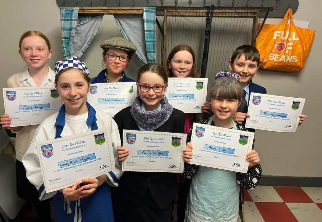 There was jubilation among the cast and supporters of the three separate acts that represented Knockavilla Donaskeigh and West Tipperary, in the County Scor na Paisti Finals, held in Halla n Feile on Sunday afternoon. The weeks and months of auditions, practice and performance were very evident with immense growth in presentation and stage confidence everyone involved in getting the acts to the stage, and the young actors and singers involved. The “novelty act” took the top accolade, when were crowned county novelty act champions, to