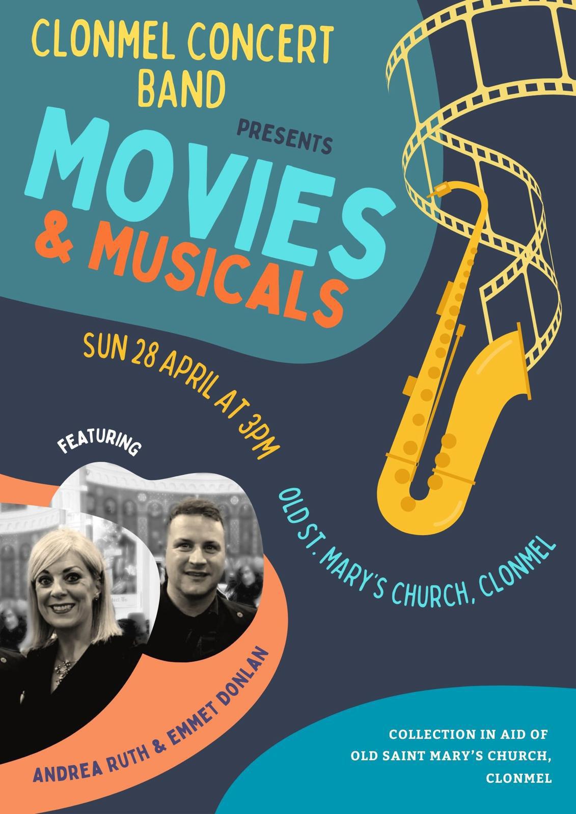 The Clonmel Concert Band will perform a Sunday afternoon concert on April 28th at Old St Mary’s Church, Clonmel from 3-4pm. With an hour of hits from stage and screen, the fabulous 45 piece Clonmel Concert Band is conducted by Danny Carroll and features singers, Andrea Ruth Houlihan and Emmet Donlan. Admission is free and a collection will be taken in aid of the upkeep of Old St Mary’s. Songs and soundtracks from some of the most popular movies and musicals, new and old, guaranteed!