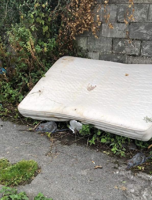 A mattress has attracted rats to the laneway Rubbish left behind by fly-tippers at the lane-way between Coleen’s Close and Heywood Close.