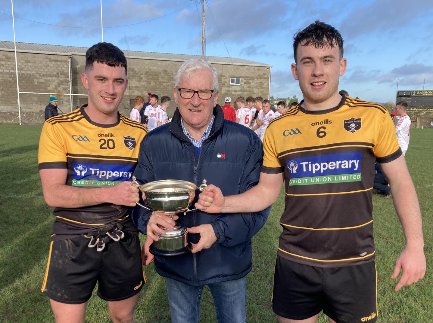 RIGHT: Nicholas Moroney, South Board chairman, presents Commercials’ captain Cian Smith with the cup after his side had defeated Fethard in the final played on Saturday last at Fethard Town Park
