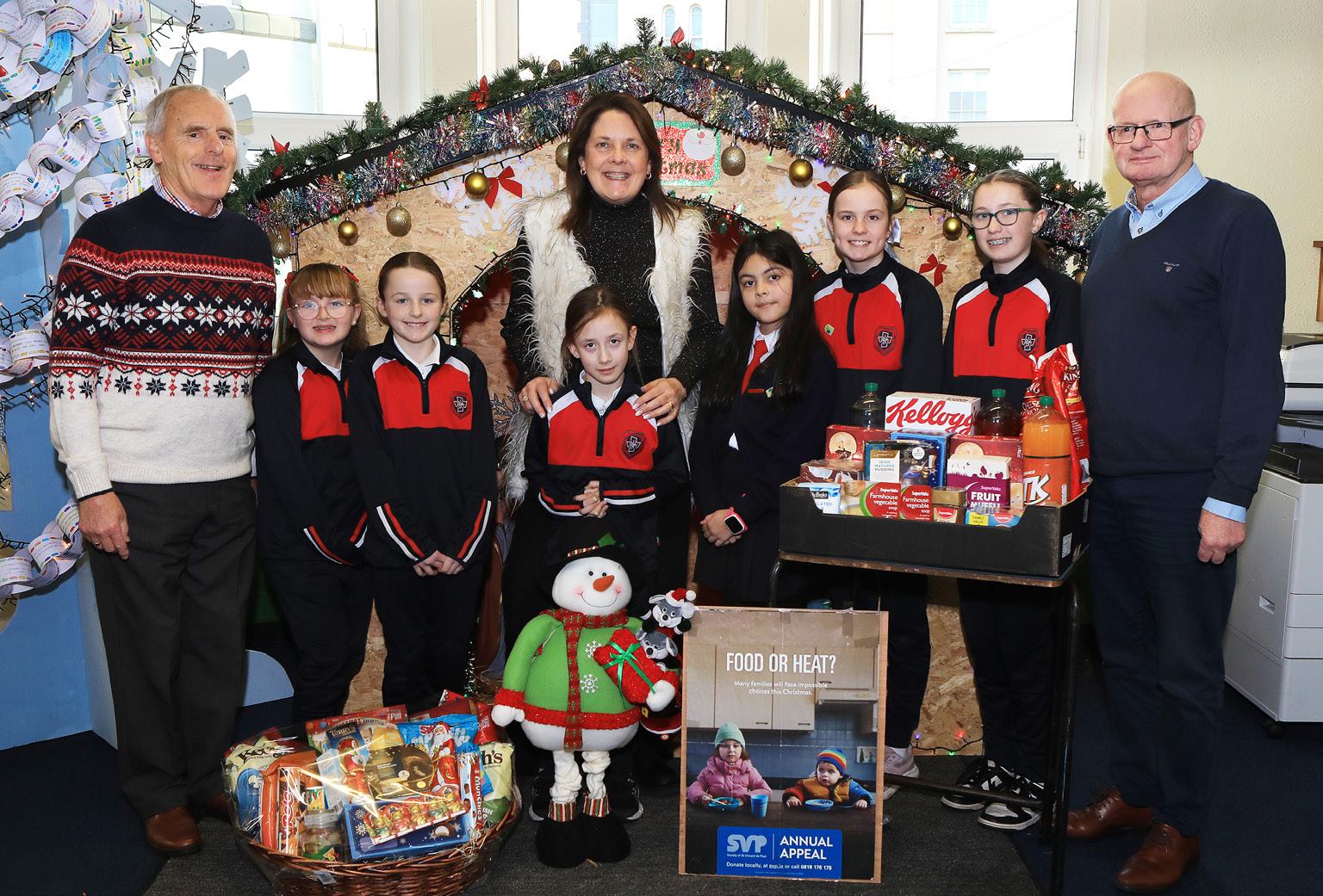 Presentation Primary School. December 2024. Michael Lonergan and John Connolly Society of St Vincent de Paul; Mrs Anne Millea along with 2nd to 6th Class students.