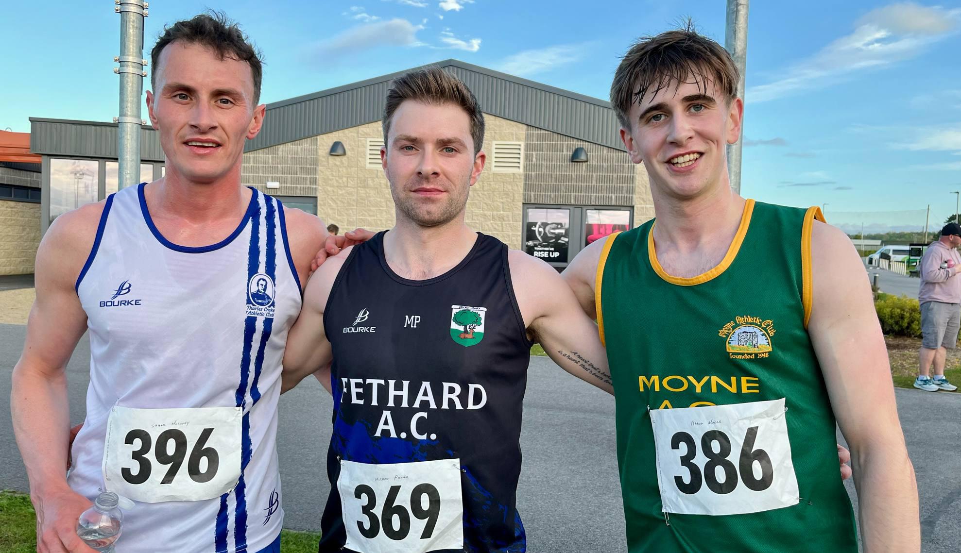 The first three men to finish in the County Novice B Road Championships held at Fethard Town Park on Saturday night last: From left to right: Shane Moloney Thurles Crokes, Michael Power Fethard AC and Aaron Moore Moyne AC.