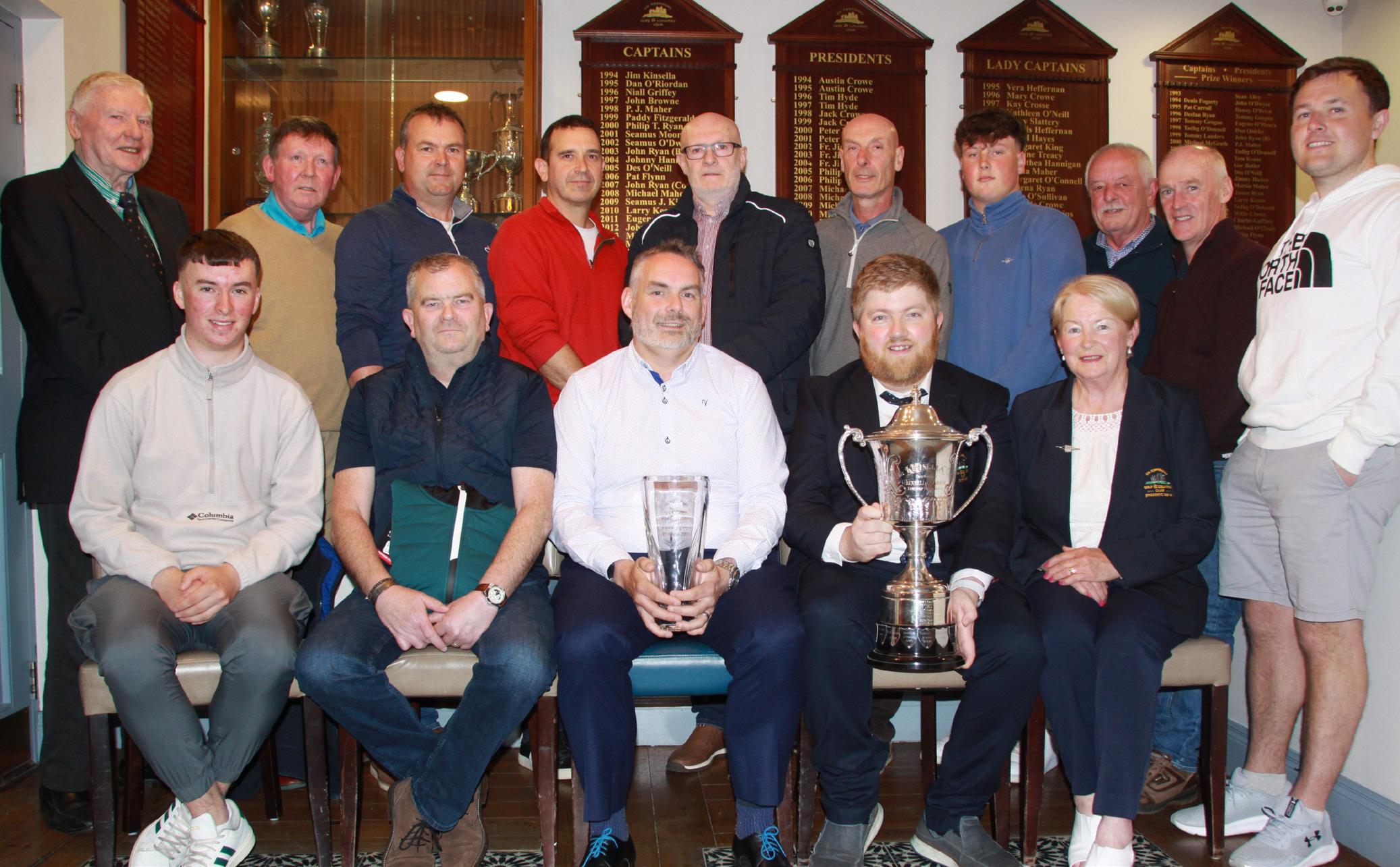 County Tipperary Golf & Country Club winners of the Kinsella Cup. Seated from left to right: Andrew Burke (Gross), Padraig Skeffington (in 2nd place, David Downey (winner of the Kinsella Cup), Captain Danny O’Dwyer & President Jenny Lawrence. Standing from left to right: Mick Keaty, Liam Ryan (Con), Edmond Tobin, Greg Marchall, David Hickey, Hugh Henessey, Sean Kinane, Philip Ryan, John Foley and Daniel Kennedy.